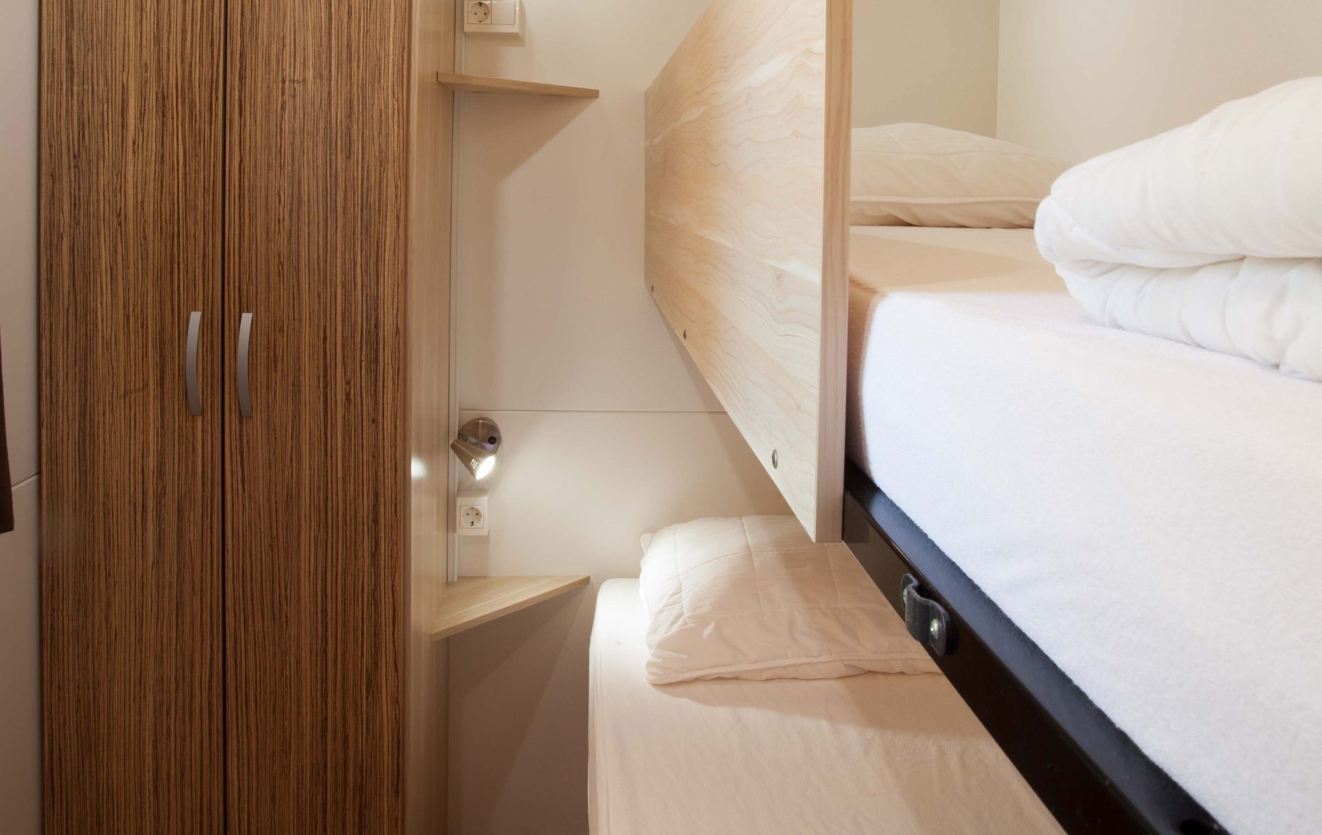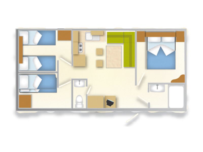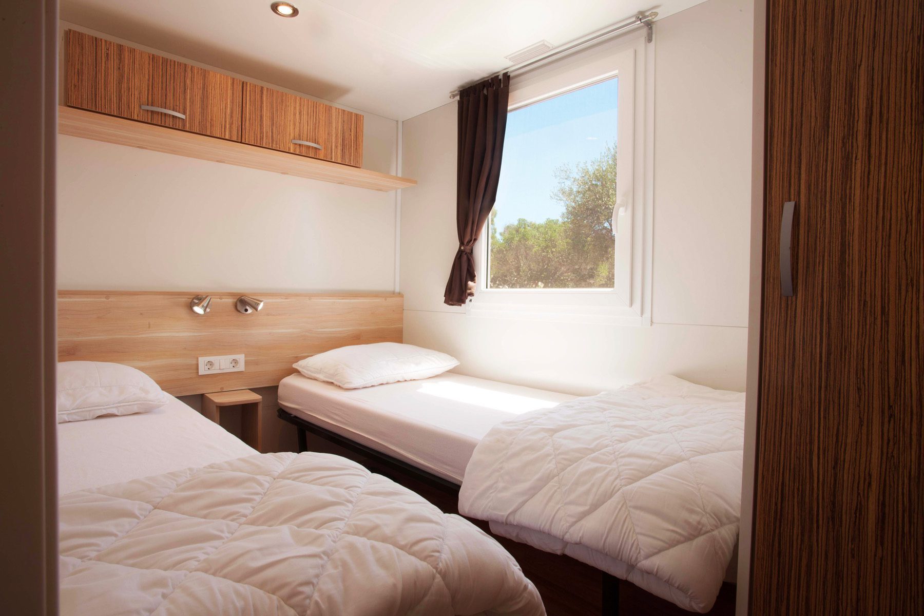 It has an area of about 34 m² and can hold a maximum of 6 people. It consists of living room with table and chairs, kitchenette equipped with refrigerator, 4-burner stove, sink, cookware and dishes. The sleeping area consists of 3 rooms, one with a double bed, one with 2 single beds and one with a bunk bed. The accommodation features 1 bathroom with shower and sink and 1 bathroom with toilet and sink. Outside is a spacious covered wooden veranda equipped with a table, chairs and two sun loungers.