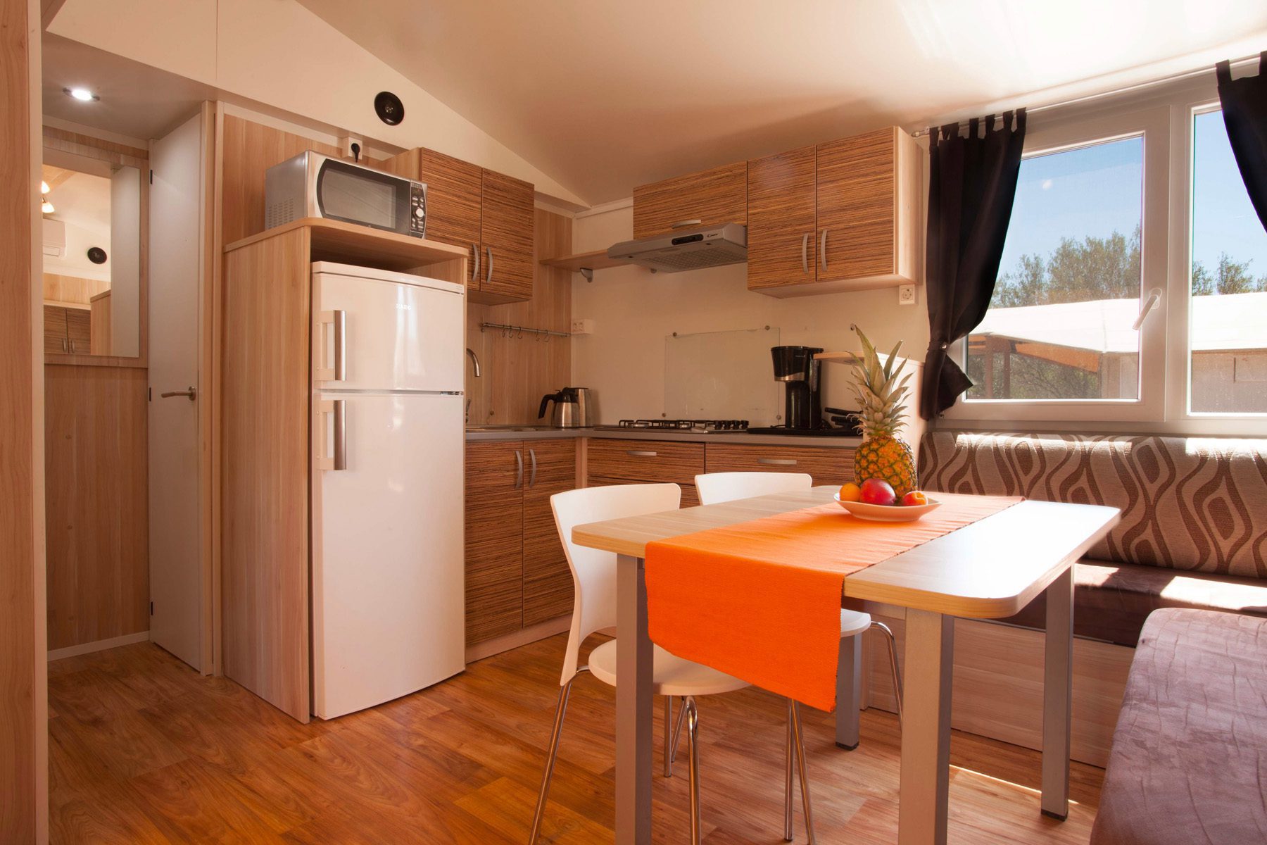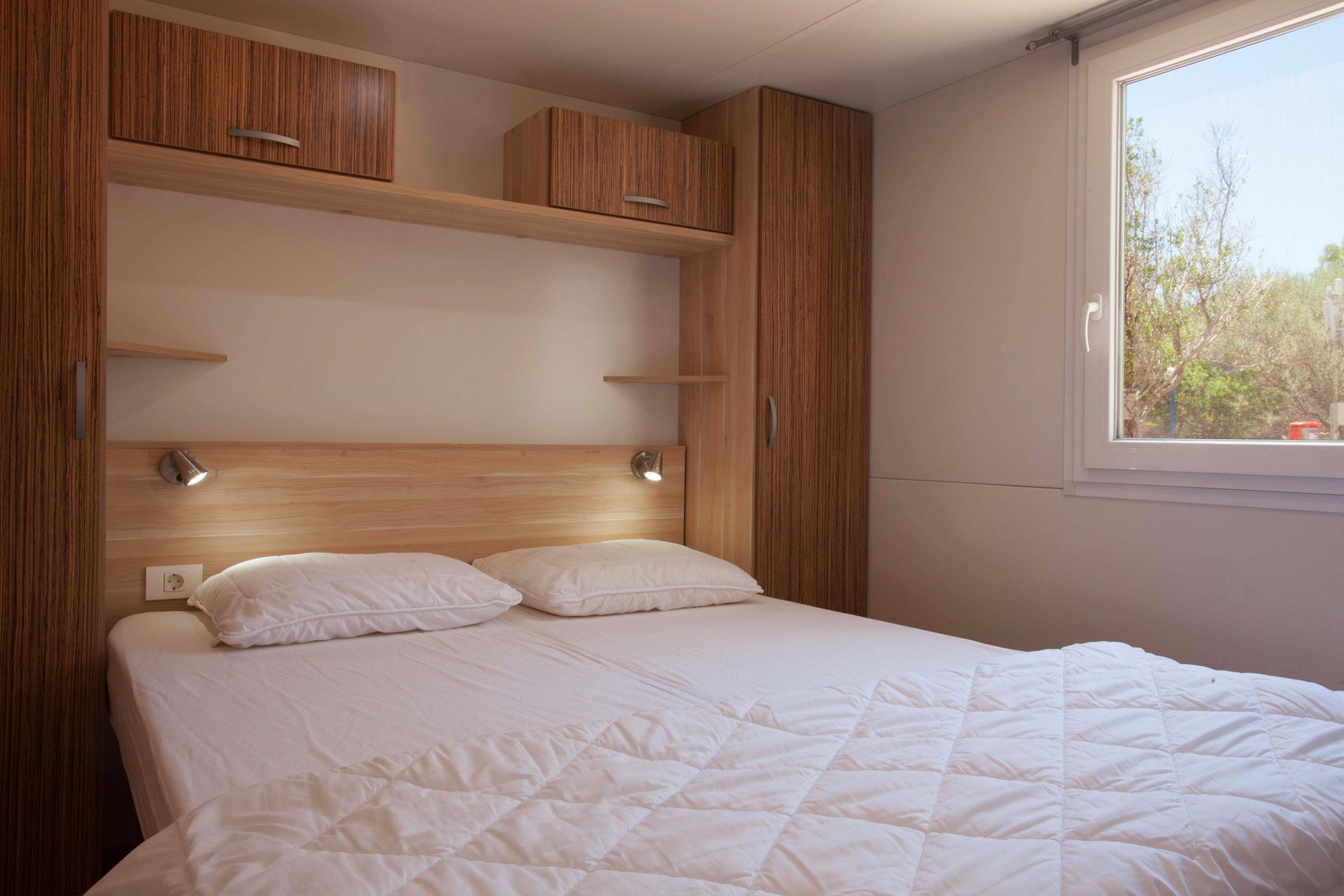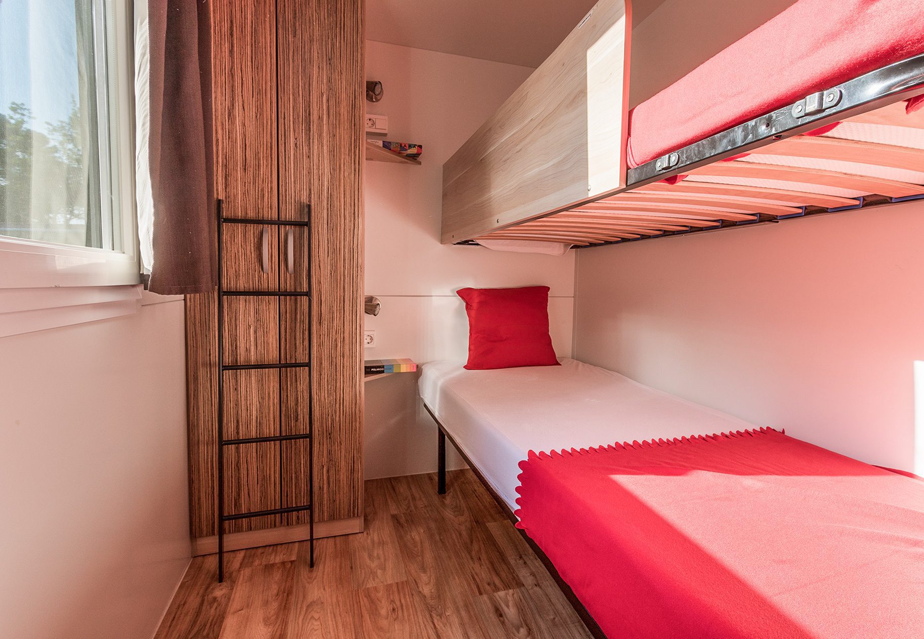 It has an area of about 34 m² and can hold a maximum of 6 people. It consists of living room with table and chairs, kitchenette equipped with refrigerator, 4-burner stove, sink, cookware and dishes. The sleeping area consists of 3 rooms, one with a double bed, one with 2 single beds and one with a bunk bed. The accommodation features 1 bathroom with shower and sink and 1 bathroom with toilet and sink. Outside is a spacious covered wooden veranda equipped with a table, chairs and two sun loungers.