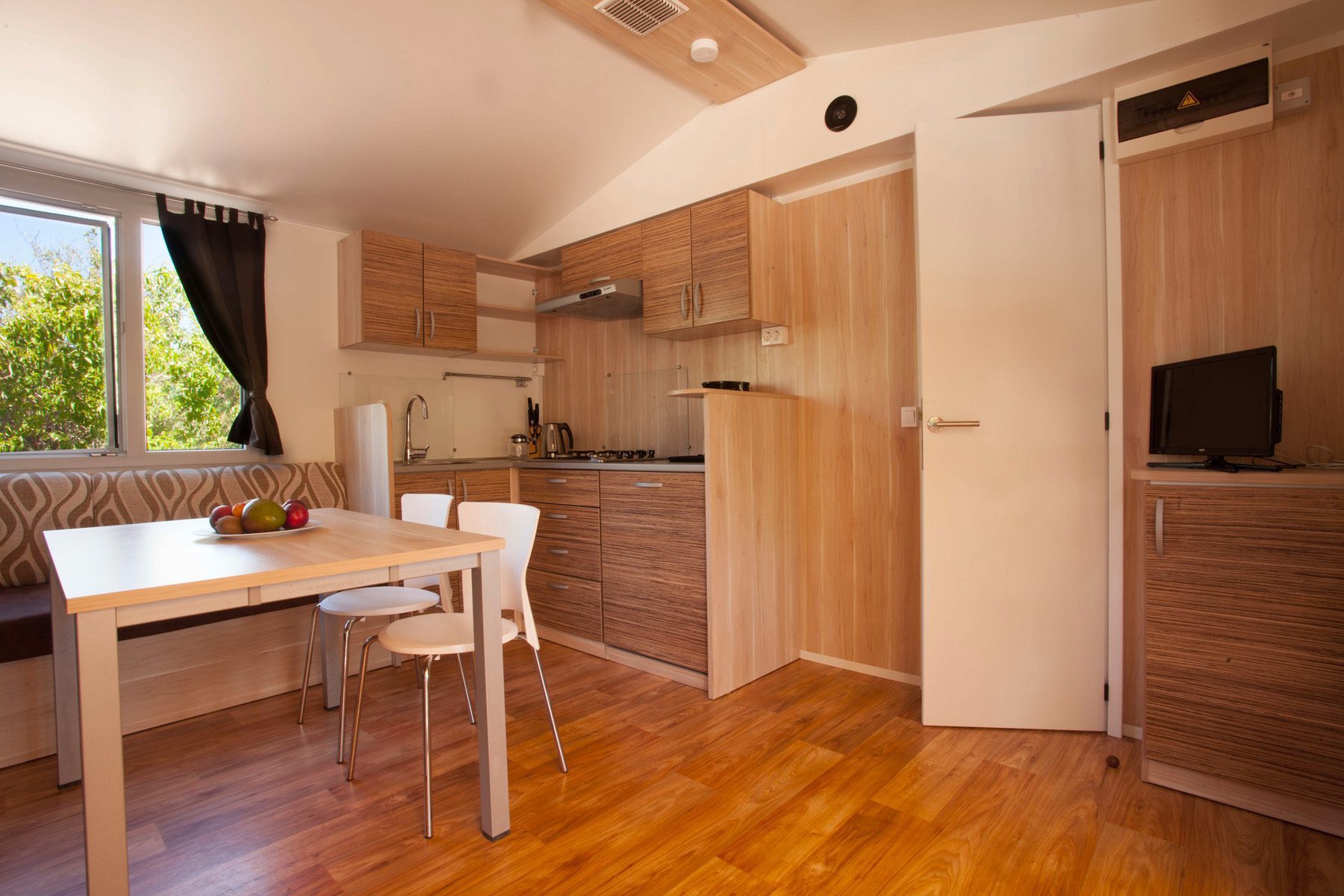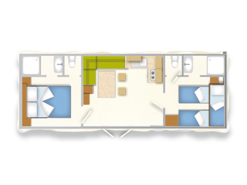 It has an area of about 34 m² and can hold a maximum of 4 adults and 1 child. It consists of living room with table and chairs, kitchenette equipped with refrigerator, 4-burner stove, sink, cookware and dishes. The sleeping area consists of 2 rooms, one with a double bed and one with 2 single beds plus a third raised bed. The accommodation features 2 full bathrooms with shower, toilet and washbasin. Outside is a spacious covered wooden veranda equipped with a table, chairs and two sun loungers.