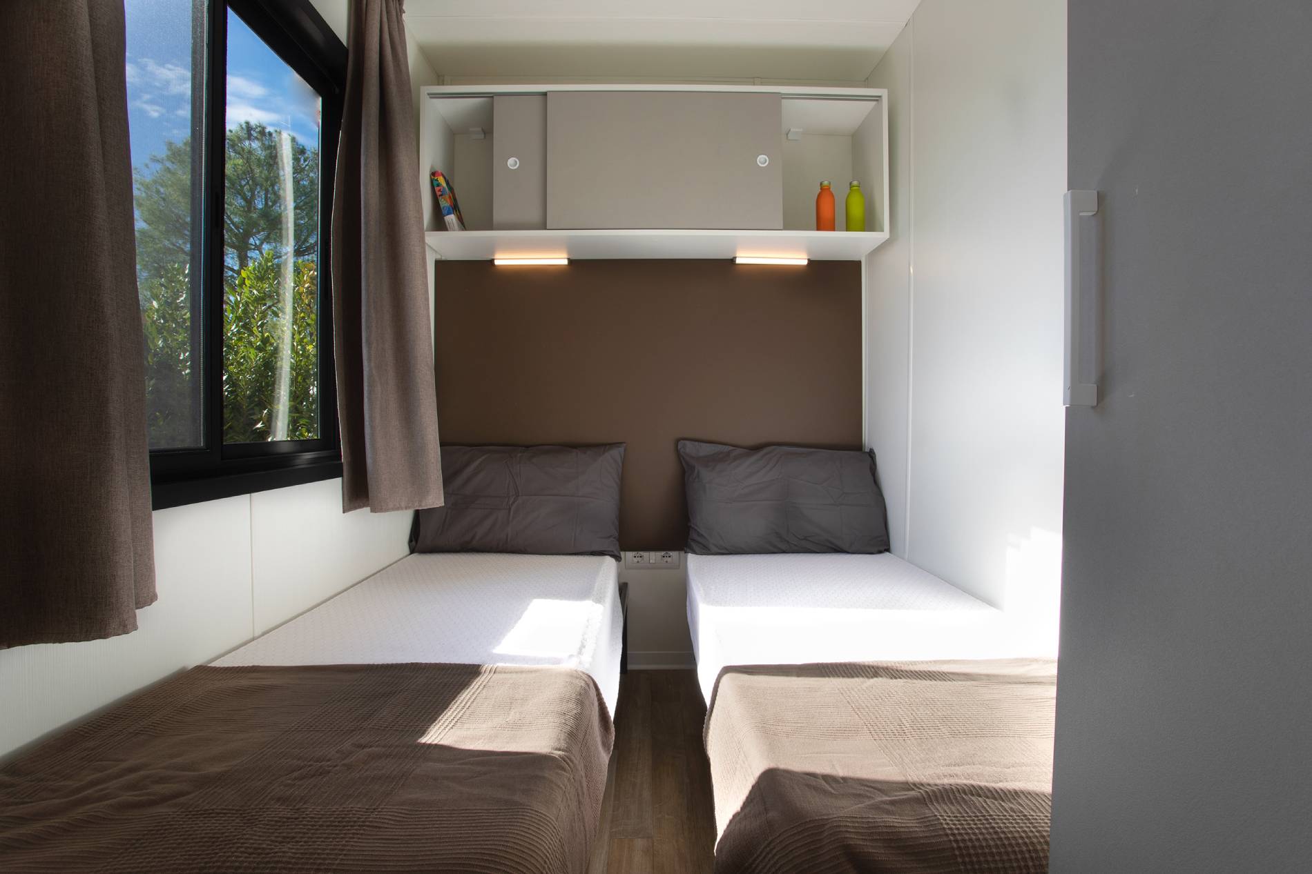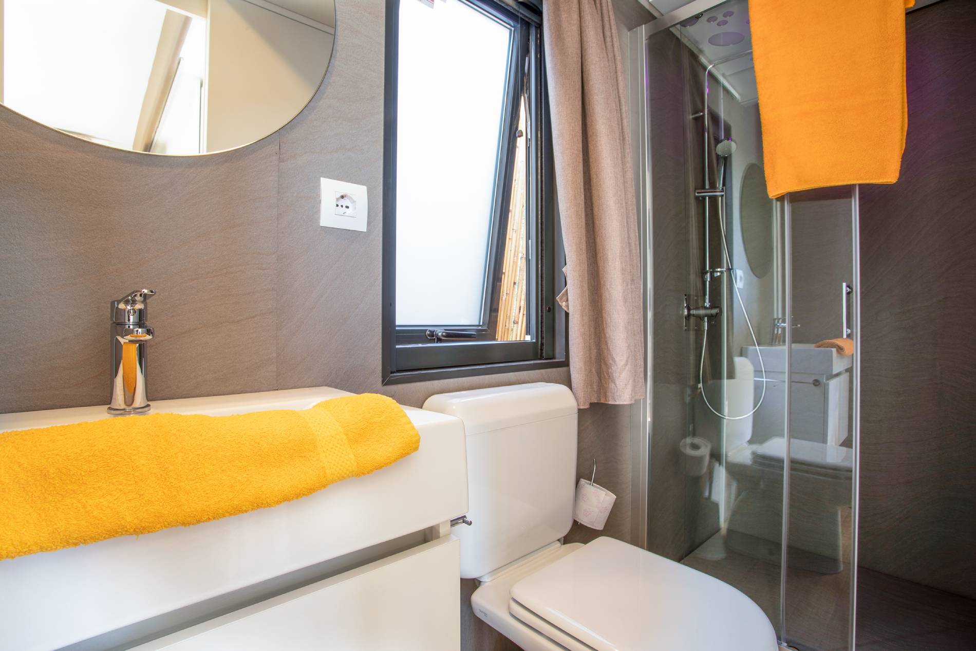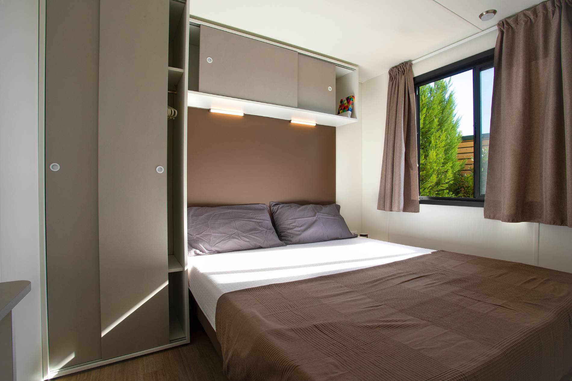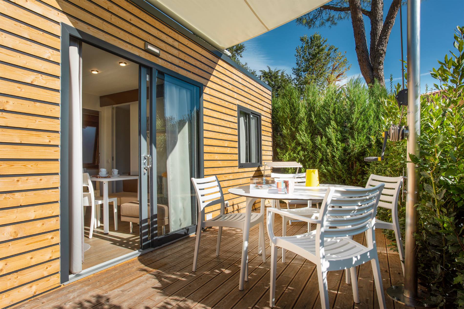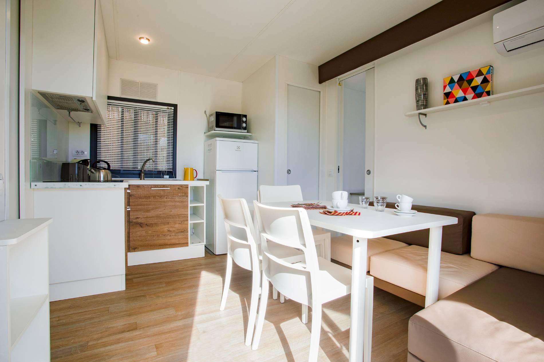 Fresh, young and cozy, the Baia Elite Mobilhome with an area of about 30 m² is designed to accommodate families of up to 6 people. The interior furnishings are modern and comfortable: a corner kitchen complete with a table, chairs, a very comfortable sofa, 4-burner stove, sink, cookware and dishes, and a pedestal refrigerator complete with freezer. The large French window, which overlooks the spacious wooden veranda gives brightness to the spacious living room, furnished with a modern sofa, table and chairs. Completing the accommodation is a sleeping area with 3 bedrooms, one with a double bed and 2 with 2 single beds, a full bathroom with toilet, shower, and sink.