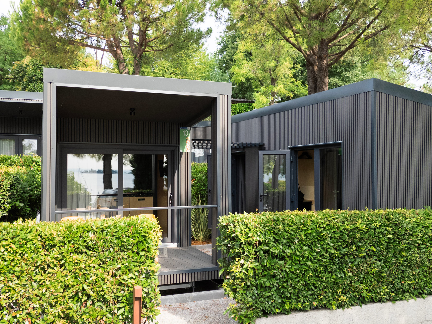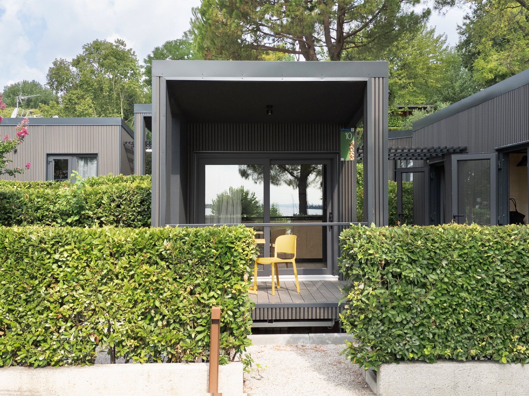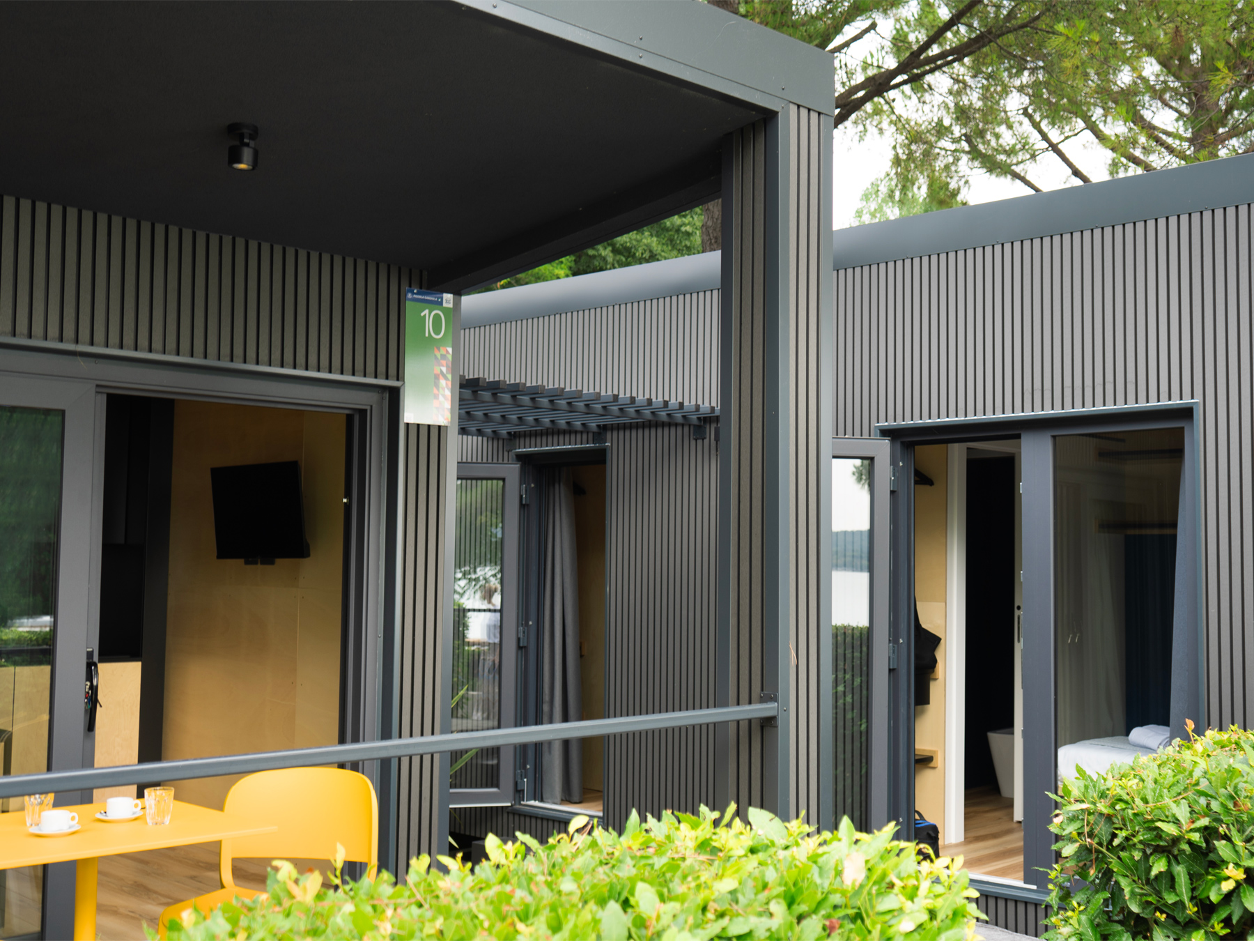 Fresh, young and cozy, the new LODGE is designed to accommodate a maximum of 4 people. A new concept idea consisting of 2 living modules: 1 sleeping area and 1 kitchen area. The interior furnishings are modern and comfortable: a kitchen complete with a table, chairs, 4-burner stove, sink, cookware and dishes, and a pedestal refrigerator complete with freezer. The large French window, which overlooks the spacious wooden veranda gives brightness to the spacious living room.