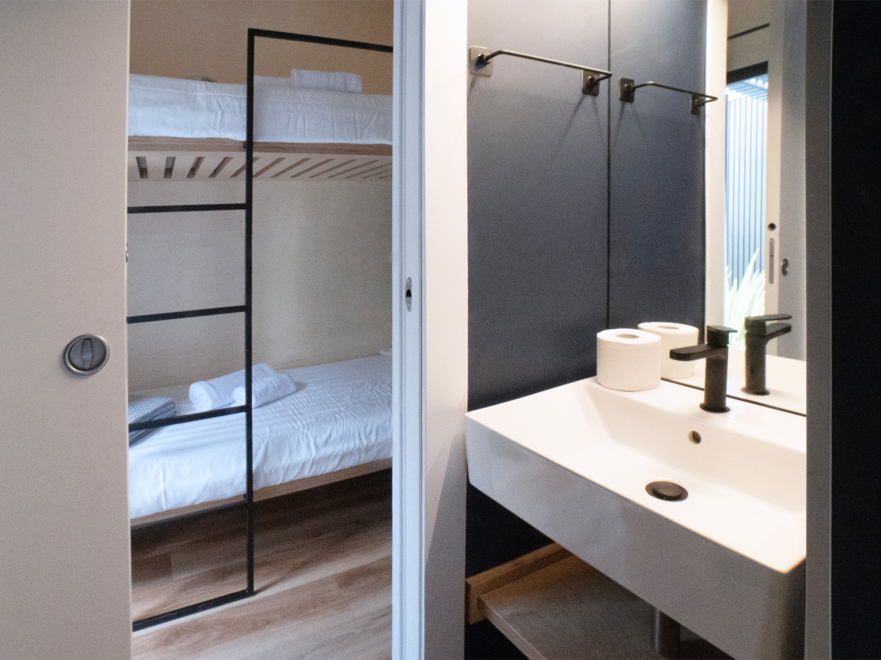 The first module consists of a master bedroom, a bedroom with a bunk bed and private bathroom; the second module has a kitchen.
