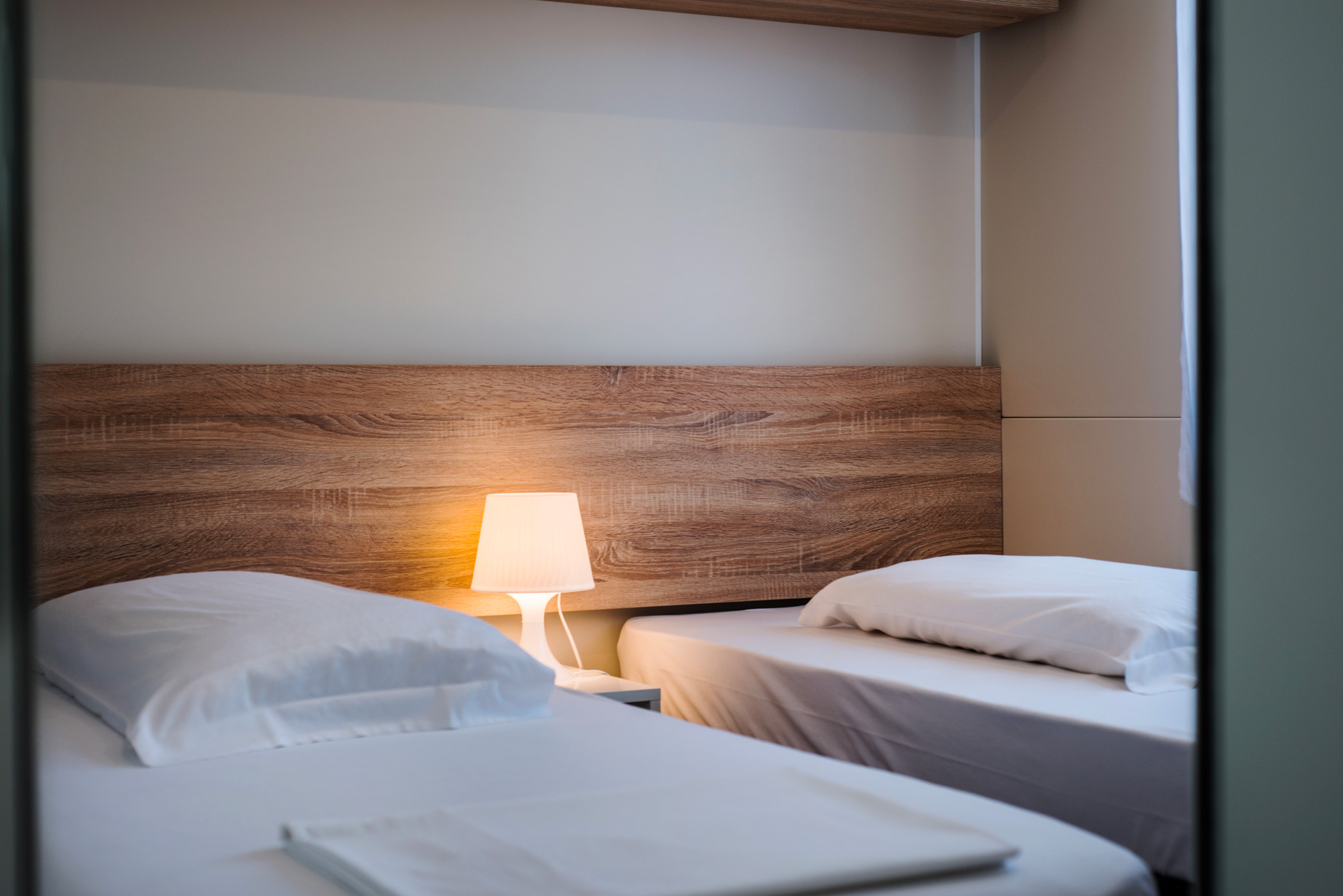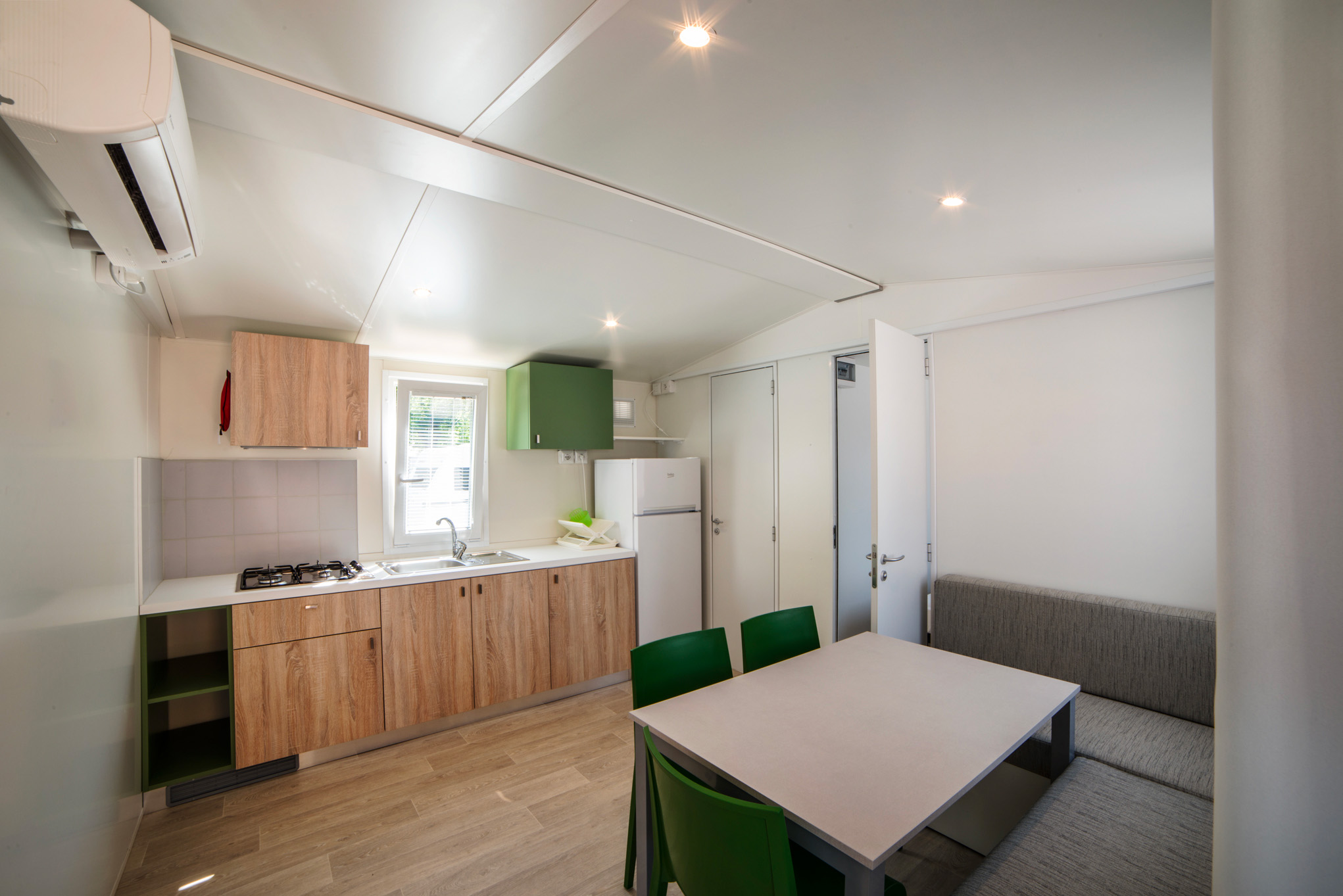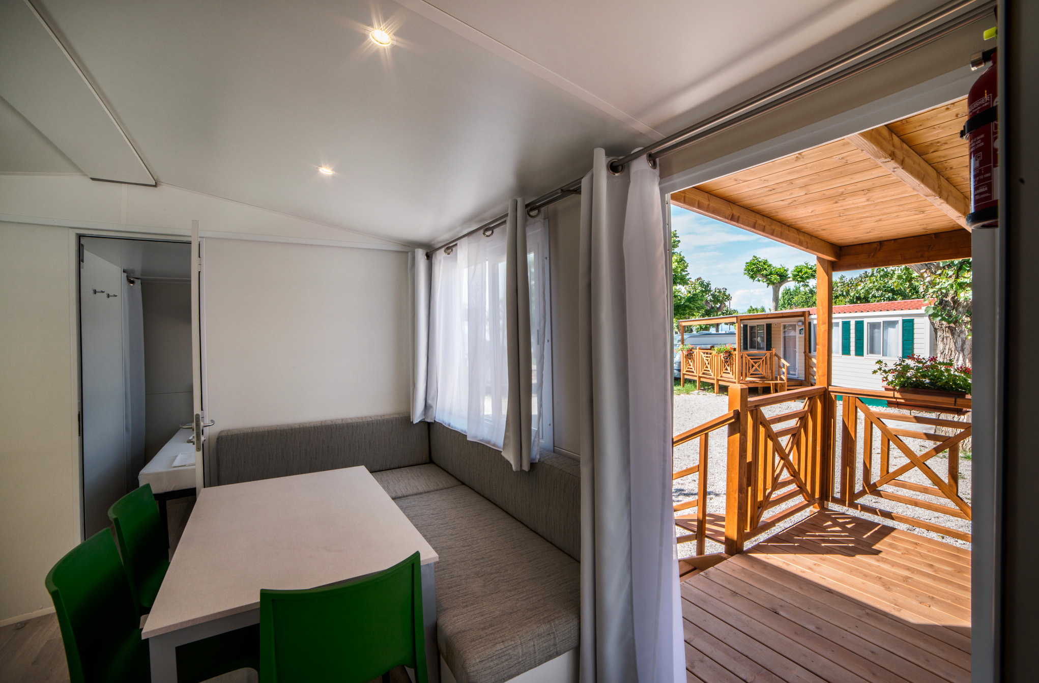 The Baia Prestige mobilehome has an area of about 30 square meters and can hold a maximum of 4 people. Consists of: kitchenette with stove, refrigerator with freezer, living room with sofa, bedroom with double bed, bedroom with 2 single beds, 1 bathroom with shower, washbasin and toilet, closet closets, small outdoor garden with table and chairs in the raised wooden terrace.