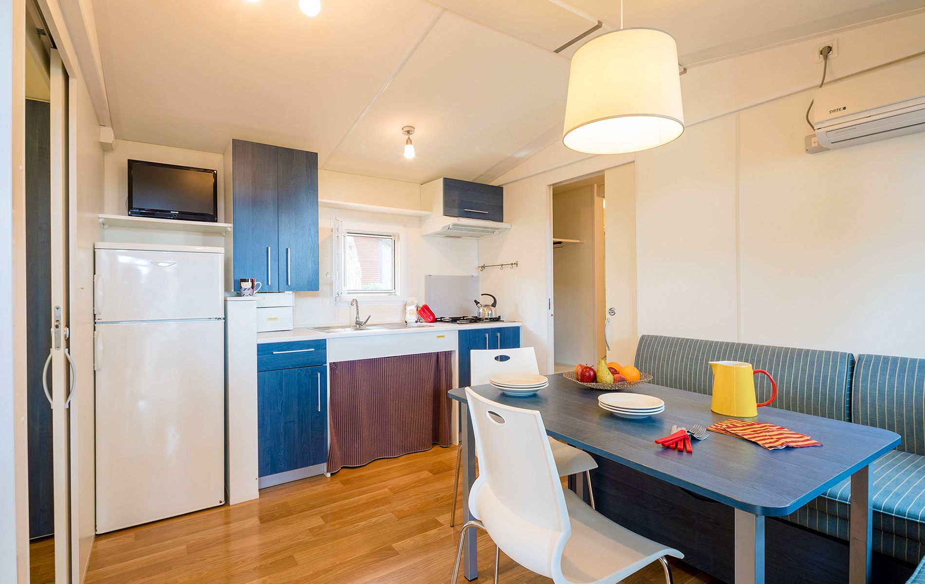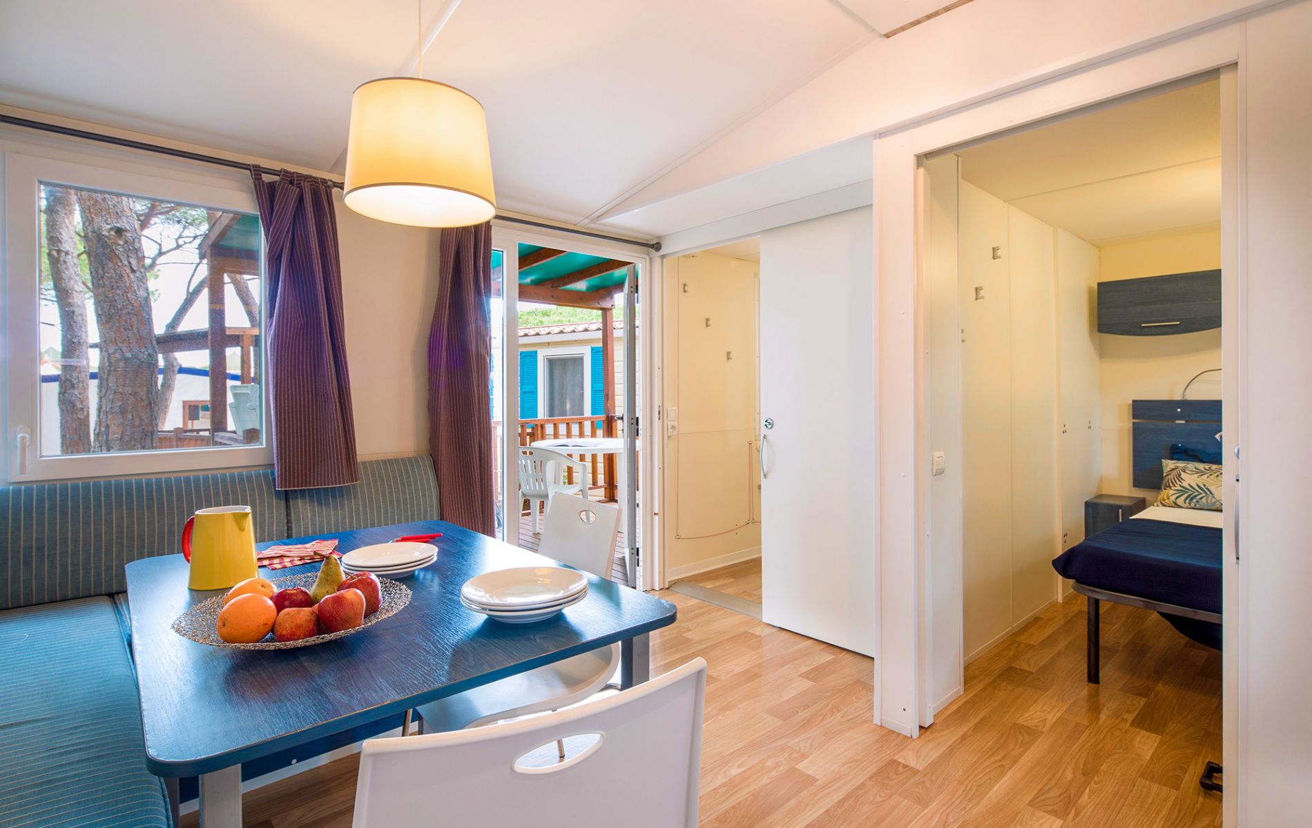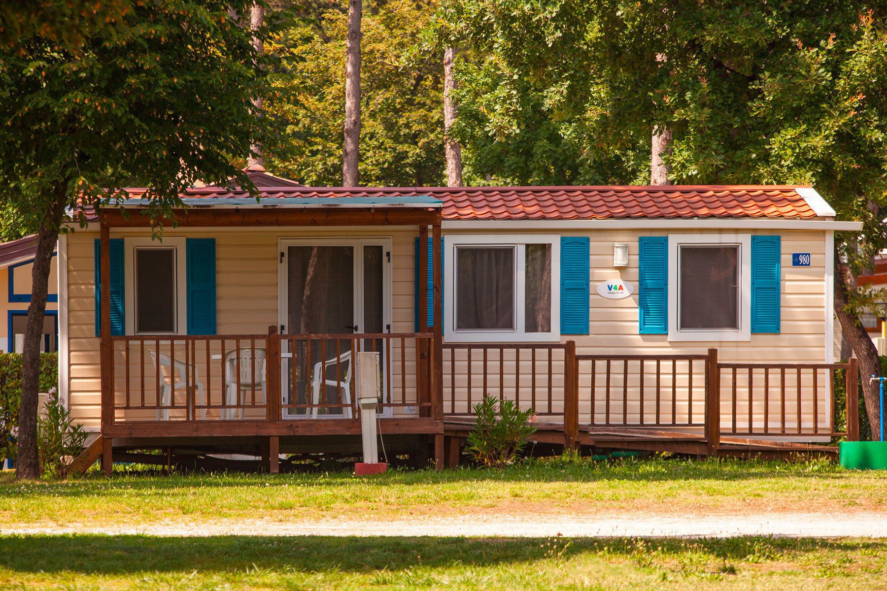 This model is designed to provide all kinds of conveniences even for people with mobility impairments and disabilities and is able to provide a better quality of vacation living. It has an area of about 32 m² and can hold a maximum of 4 people. It consists of a living room with table and chairs, kitchenette equipped with column refrigerator complete with freezer, 4-burner stove, sink, cookware and dishes. The sleeping area consists of 2 rooms, one with a double bed and one with 2 single beds. The accommodation is equipped with 2 full bathrooms with toilet, shower and sink. A covered wooden veranda equipped with table and chairs completes the accommodation.
