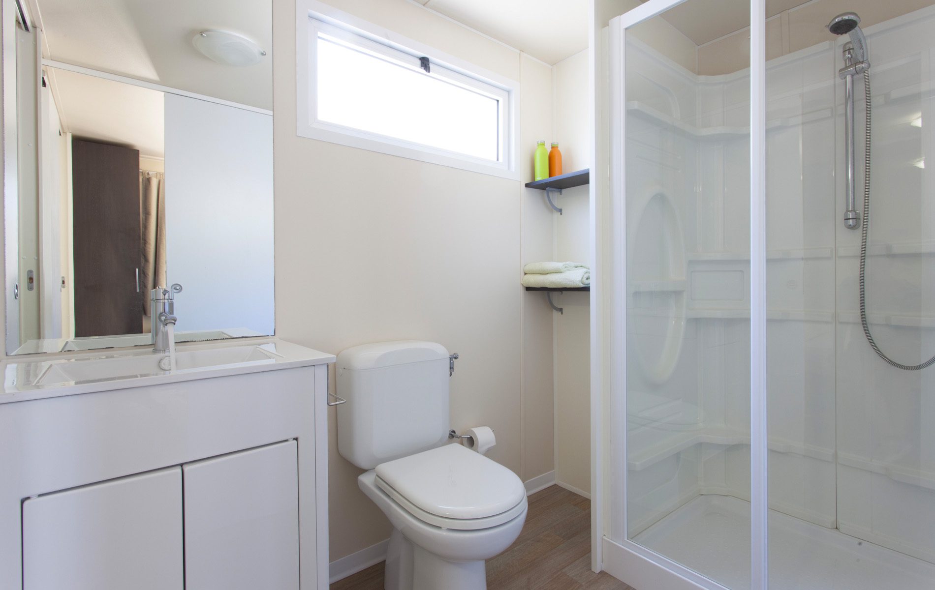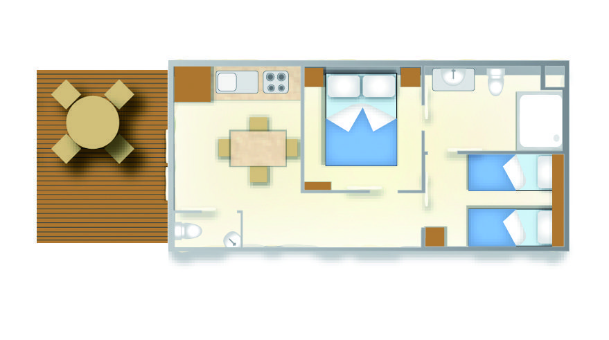 It has an area of about 25.5 m² and can hold a maximum of 4 people. It consists of a living room with table and chairs, kitchenette equipped with column refrigerator complete with freezer, 4-burner stove, sink, cookware and dishes. The sleeping area consists of 2 rooms, one with a double bed and one with 2 single beds. The accommodation has 1 full bathroom with toilet, shower and sink and 1 bathroom with toilet and sink. A covered wooden veranda equipped with a table and chairs allows you to enjoy the outdoors, typical of a nature vacation.