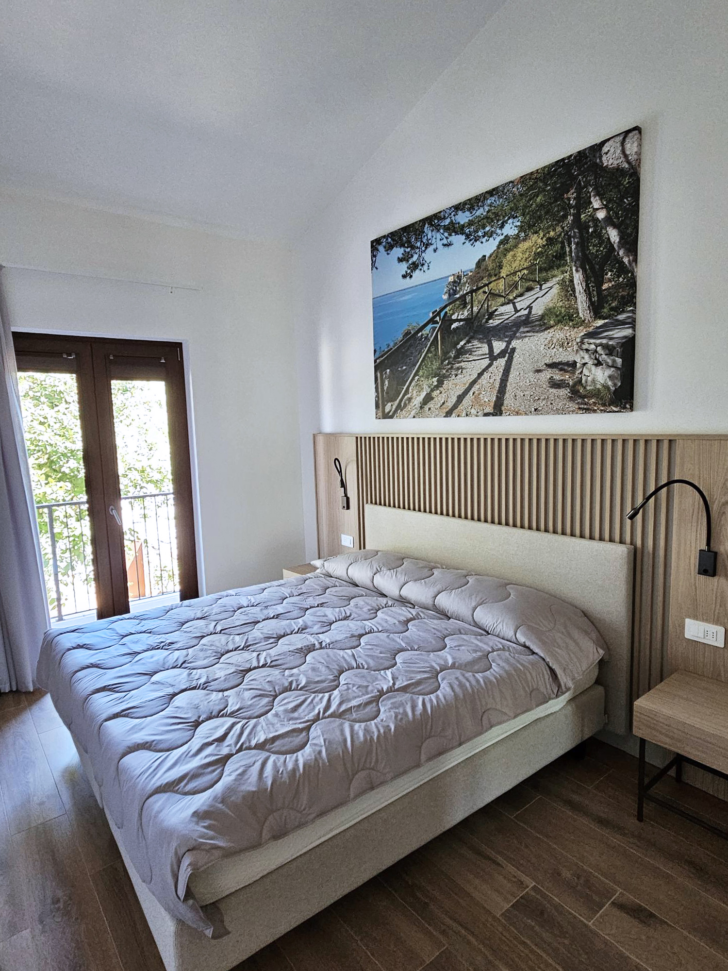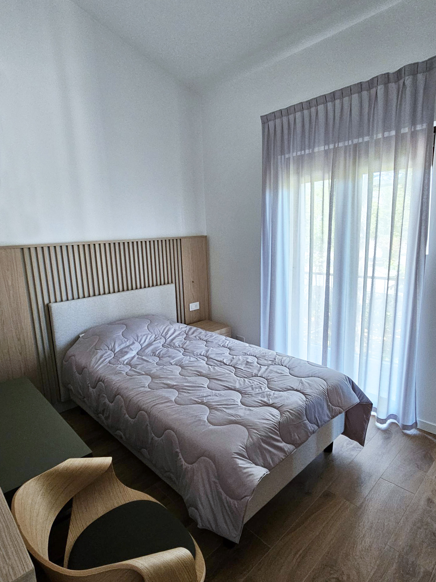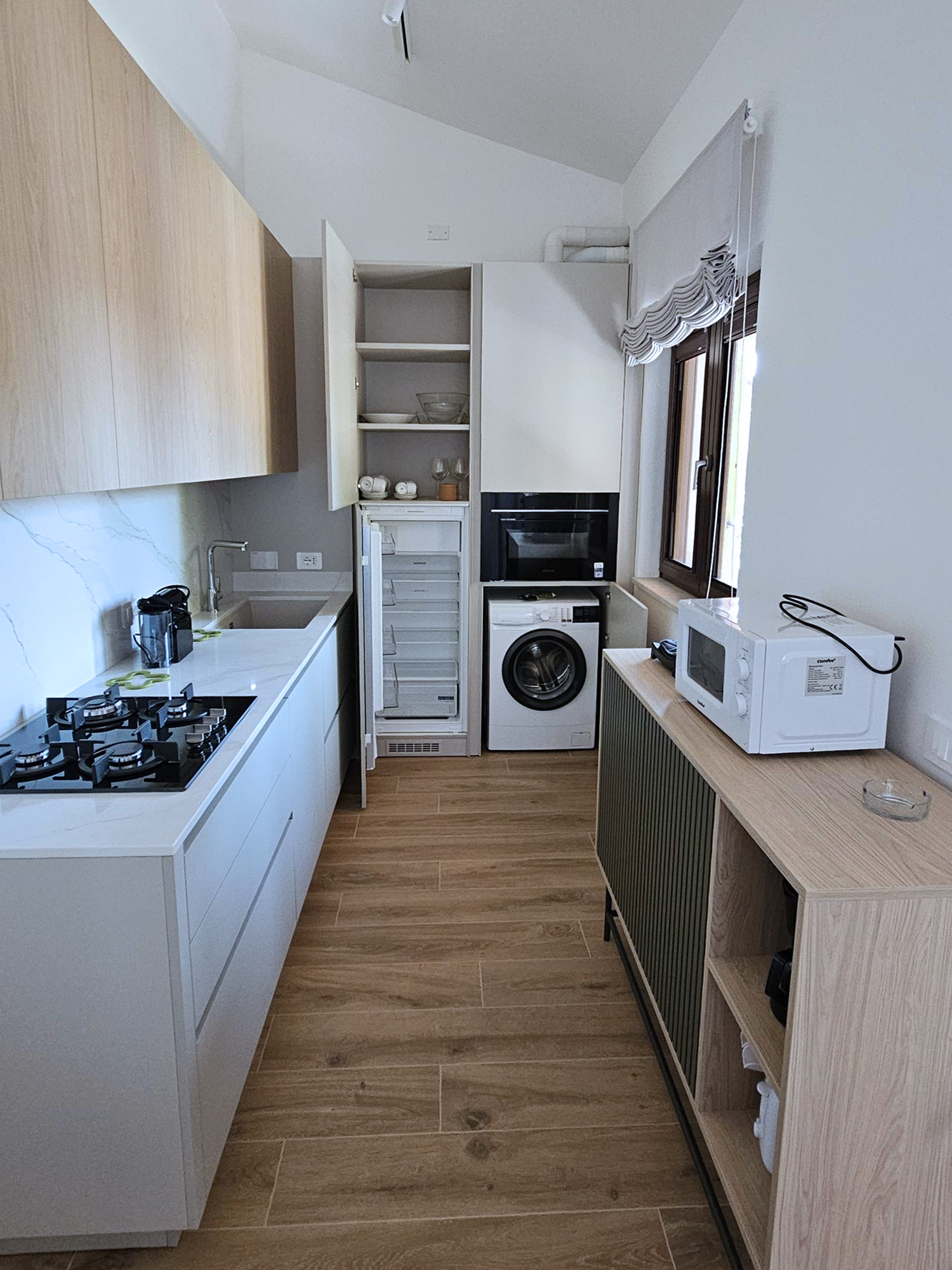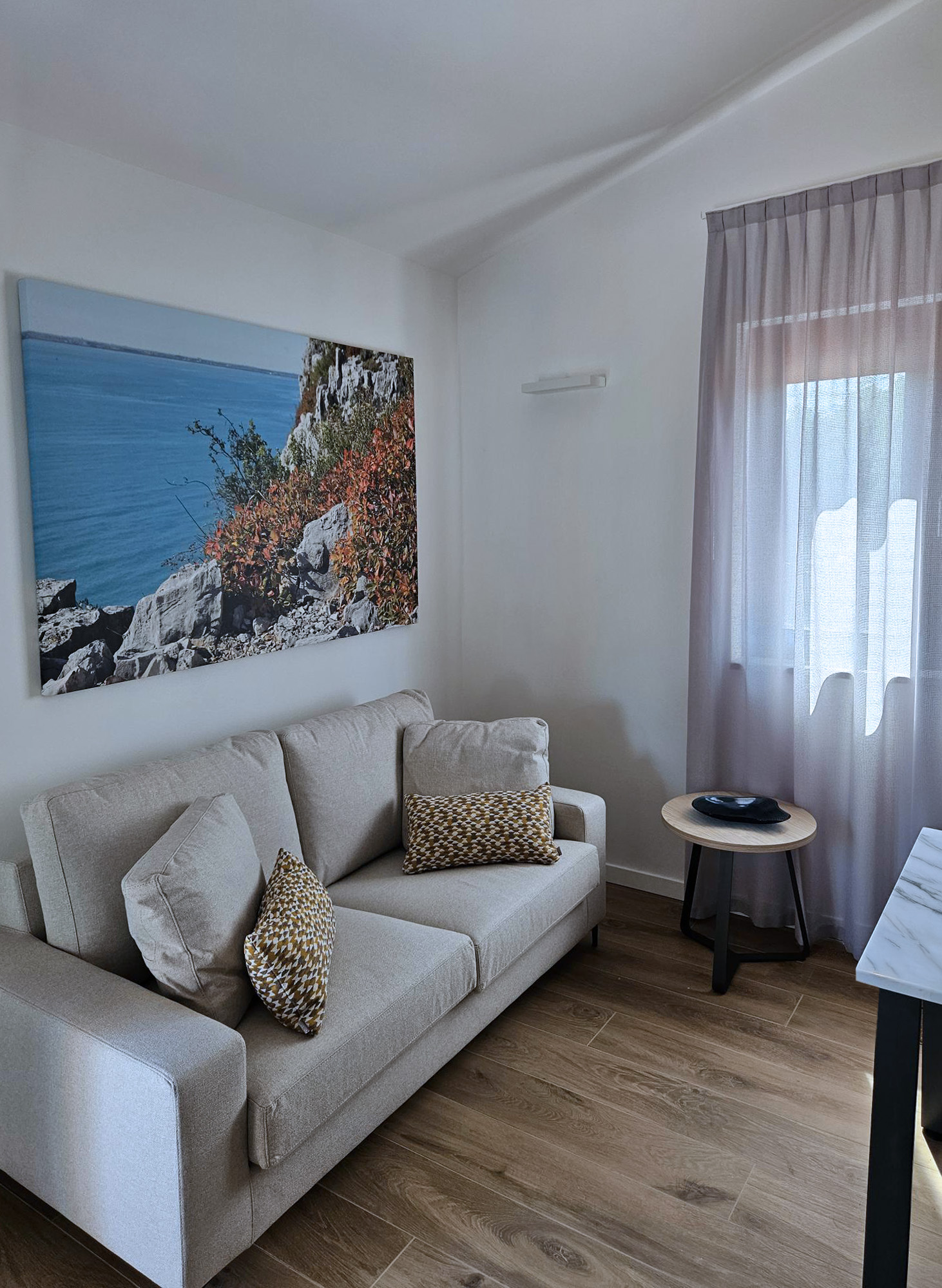Located on the second floor, this apartment has an area of about 60 m². Inside there is a large living room with a sofa, a kitchen equipped with all useful accessories for a comfortable stay, such as a stove, dishwasher, multifunctional oven, refrigerator with freezer compartment, cutlery and accessories. A bathroom with shower and two bedrooms complete the apartment: one double (with the possibility of converting it into two single beds) and one with a single bed. It is an ideal solution to accommodate up to 3 people. The apartment is equipped with TV, air conditioning system and washing machine. A balcony is present.