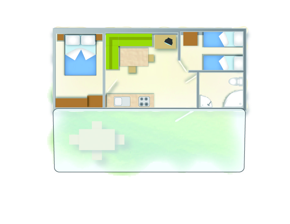 Le case mobili tipo Comfort sono situate in un’area riservata, a poca distanza dal mare, completamente immerse nel verde del prato inglese e nell’allegro colore degli oleandri. Perfettamente isolate e funzionali, hanno una superficie di circa 22 m² e possono ospitare 4 adulti e un bambino. Sono composte da soggiorno con tavolo e sedute ad angolo ricavate su un comodo divano/letto, angolo cottura attrezzato con frigorifero con ghiacciaia, piano cottura a 4 fuochi, lavello, pentolame e stoviglie. Completano l’alloggio 2 camere, una matrimoniale e una con 2 letti singoli, 1 bagno completo con WC, doccia e lavabo. All’esterno una veranda coperta che si estende per tutta la lunghezza della casa mobile è il luogo ideale per godere di una vacanza all’aria aperta.