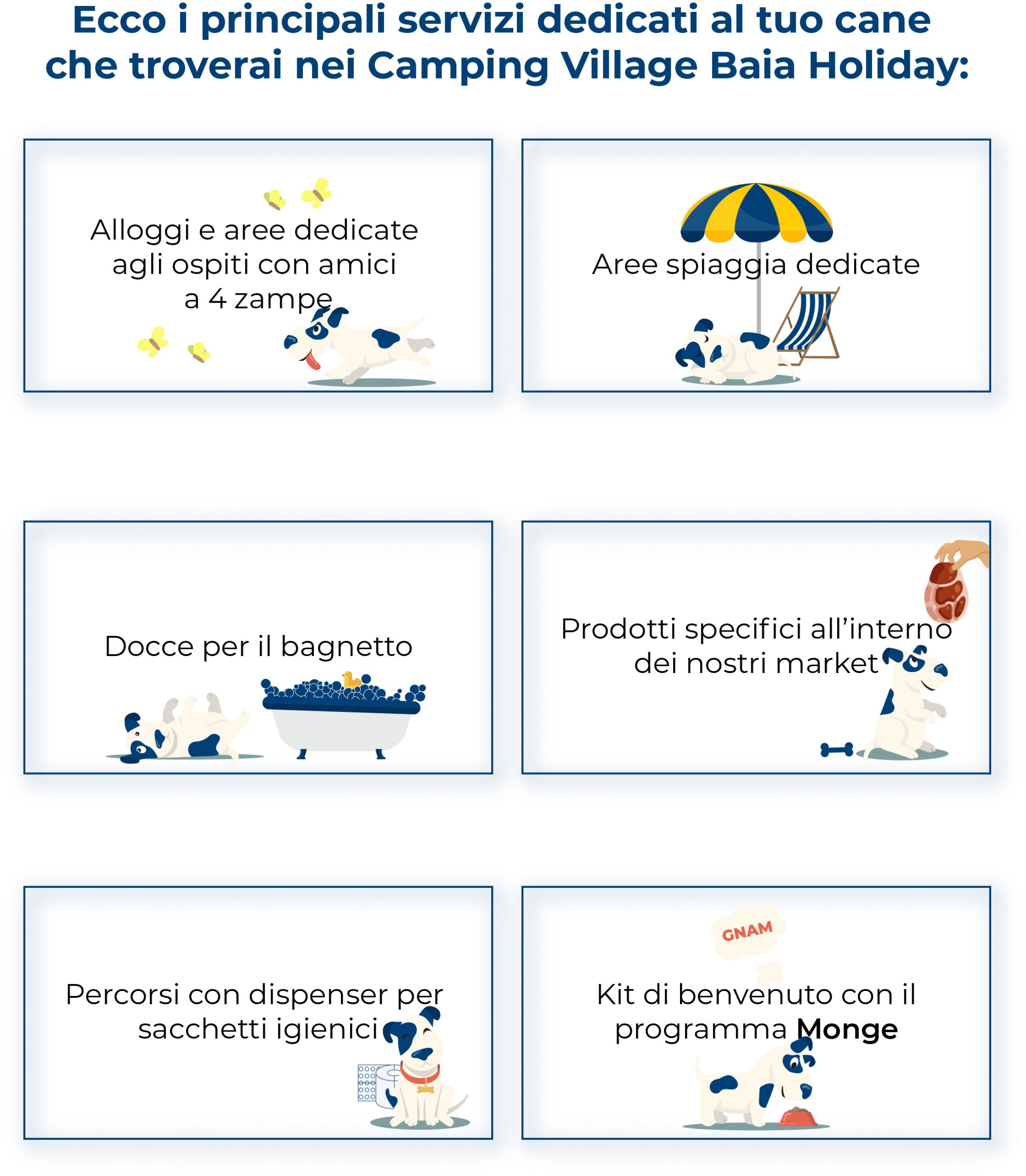 All’interno del Camping Village Laguna Blu sono disponibili sistemazioni, sia piazzole che case mobili, diversi servizi e coccole per gli ospiti con amici a 4 zampe!