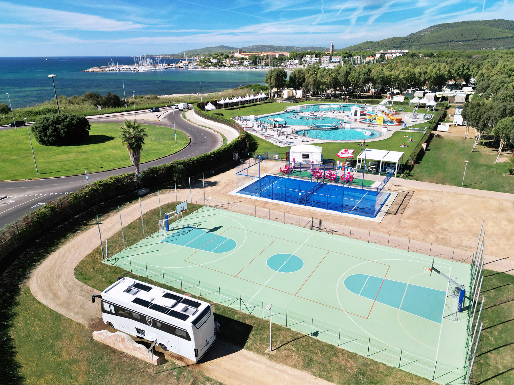 Park Wodny w Camping Village Laguna Blu in Alghero, z kompleksem basenów i atrakcji dla wszystkich jest nowoczesny i oferuje szereg usług i udogodnień dla rozrywki wszystkich naszych gości. Park znajduje się w pobliżu laguny i gwarantuje bezpieczną i pełną atrakcji przestrzeń dla najmłodszych gości.