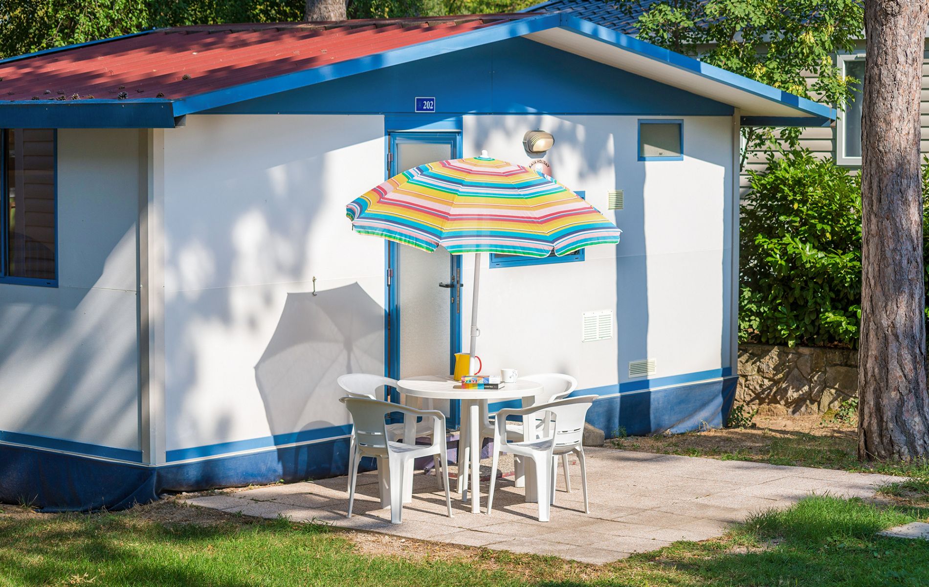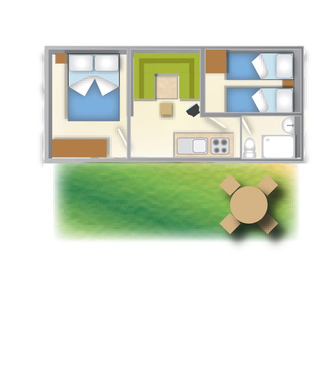 Ma powierzchnię około 19 m² i może pomieścić maksymalnie 4 osoby. Składa się z salonu ze stołem i narożnikiem na wygodnej sofie, aneksu kuchennego wyposażonego w lodówkę z kostkarką do lodu, 4-palnikową płytę grzejną, zlewozmywak, garnki, patelnie i naczynia. Obiekt obejmuje 2 sypialnie, w tym jedną z łóżkiem podwójnym i jedną z 2 łóżkami pojedynczymi, 1 kompletną łazienkę z toaletą, prysznicem i umywalką. Na zewnątrz znajduje się parasol ze stołem i krzesłami, gdzie można cieszyć się chwilami relaksu.