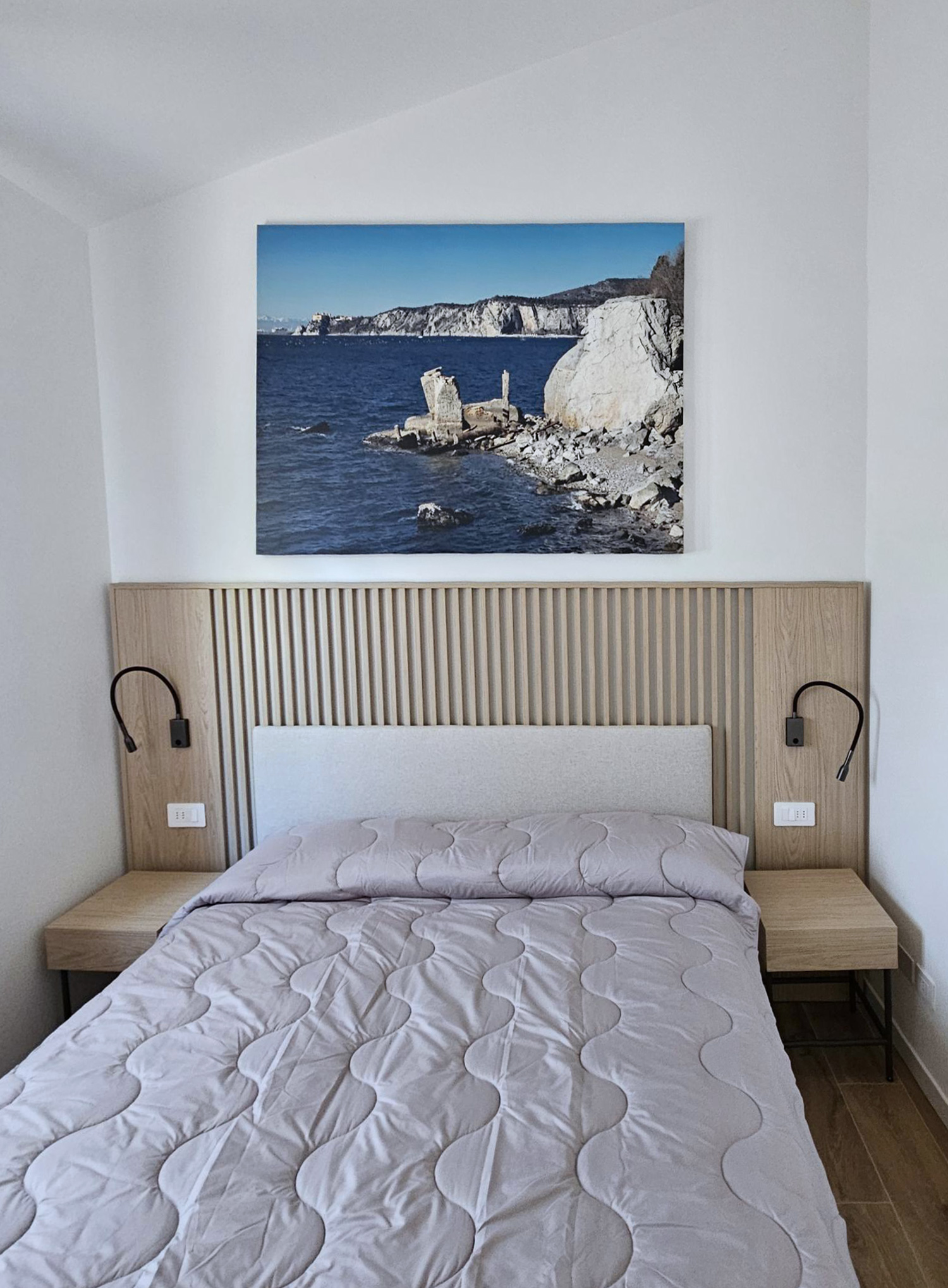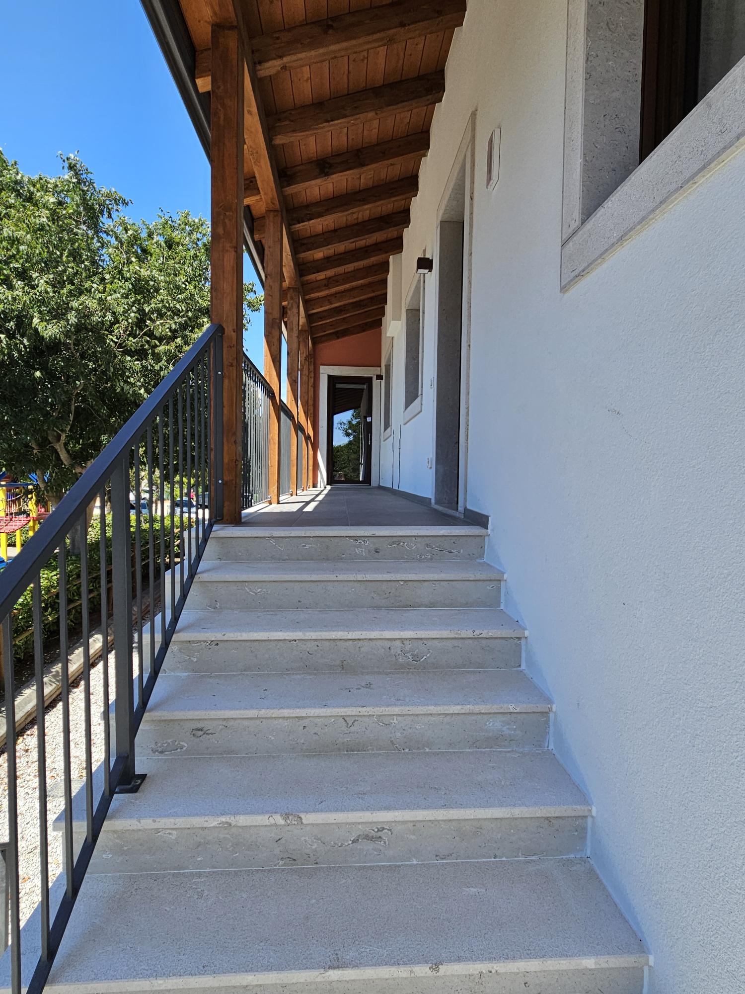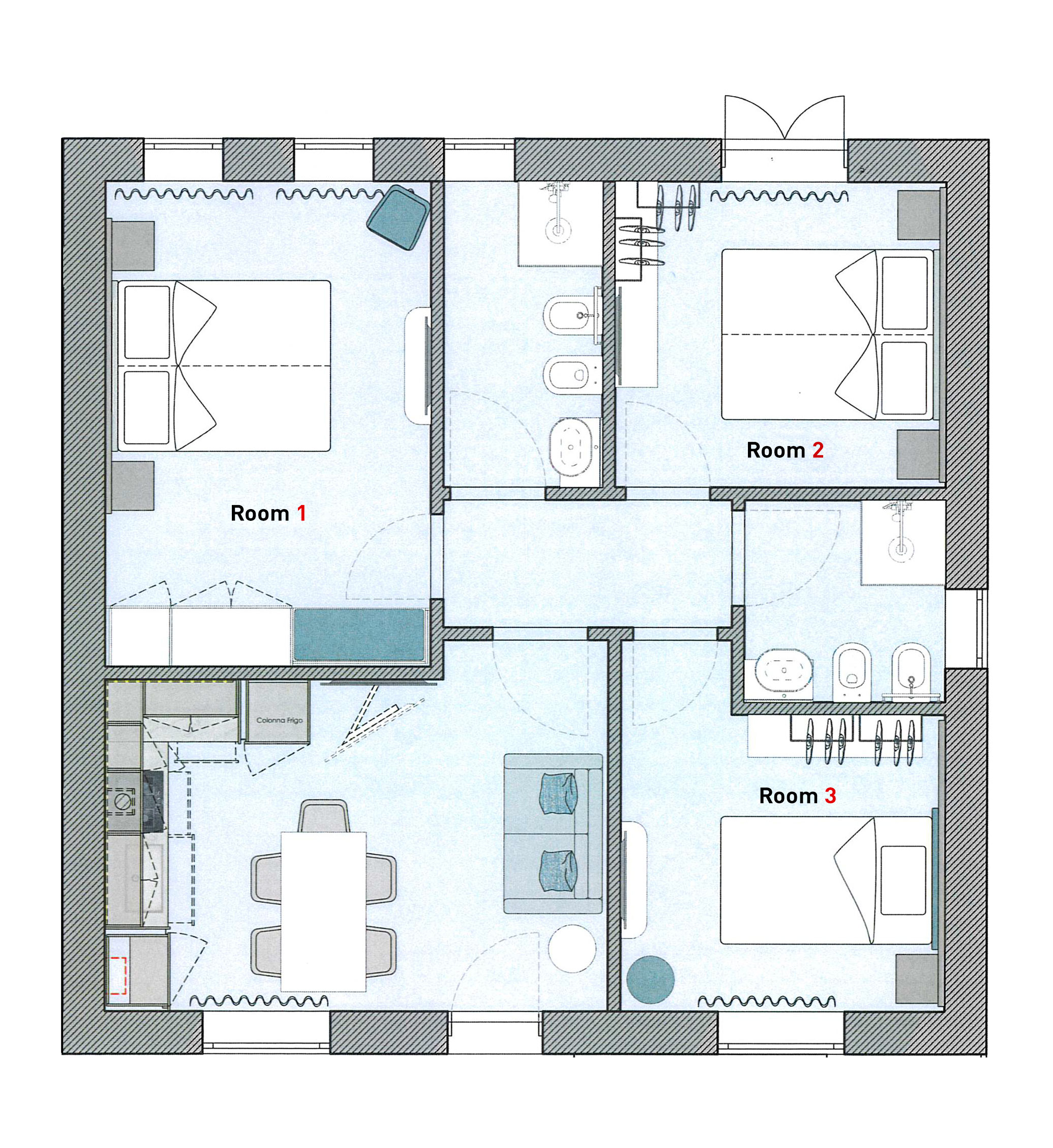 Położone na pierwszym piętrze mieszkanie ma powierzchnię około 80 m². Wewnątrz znajduje się duży salon z sofą, kuchnia wyposażona we wszystkie przydatne akcesoria do komfortowego pobytu, takie jak kuchenka, zmywarka, wielofunkcyjny piekarnik, lodówka z zamrażarką, sztućce i akcesoria. Dwie łazienki z prysznicami, sypialnia z łóżkiem podwójnym (które można rozdzielić na dwa pojedyncze), sypialnia z dwoma łóżkami pojedynczymi (które można połączyć w łóżko podwójne) oraz sypialnia z łóżkiem pojedynczym uzupełniają mieszkanie. Jest to idealne rozwiązanie dla maksymalnie pięciu osób. Do dyspozycji Gości jest telewizor, klimatyzacja i pralka.