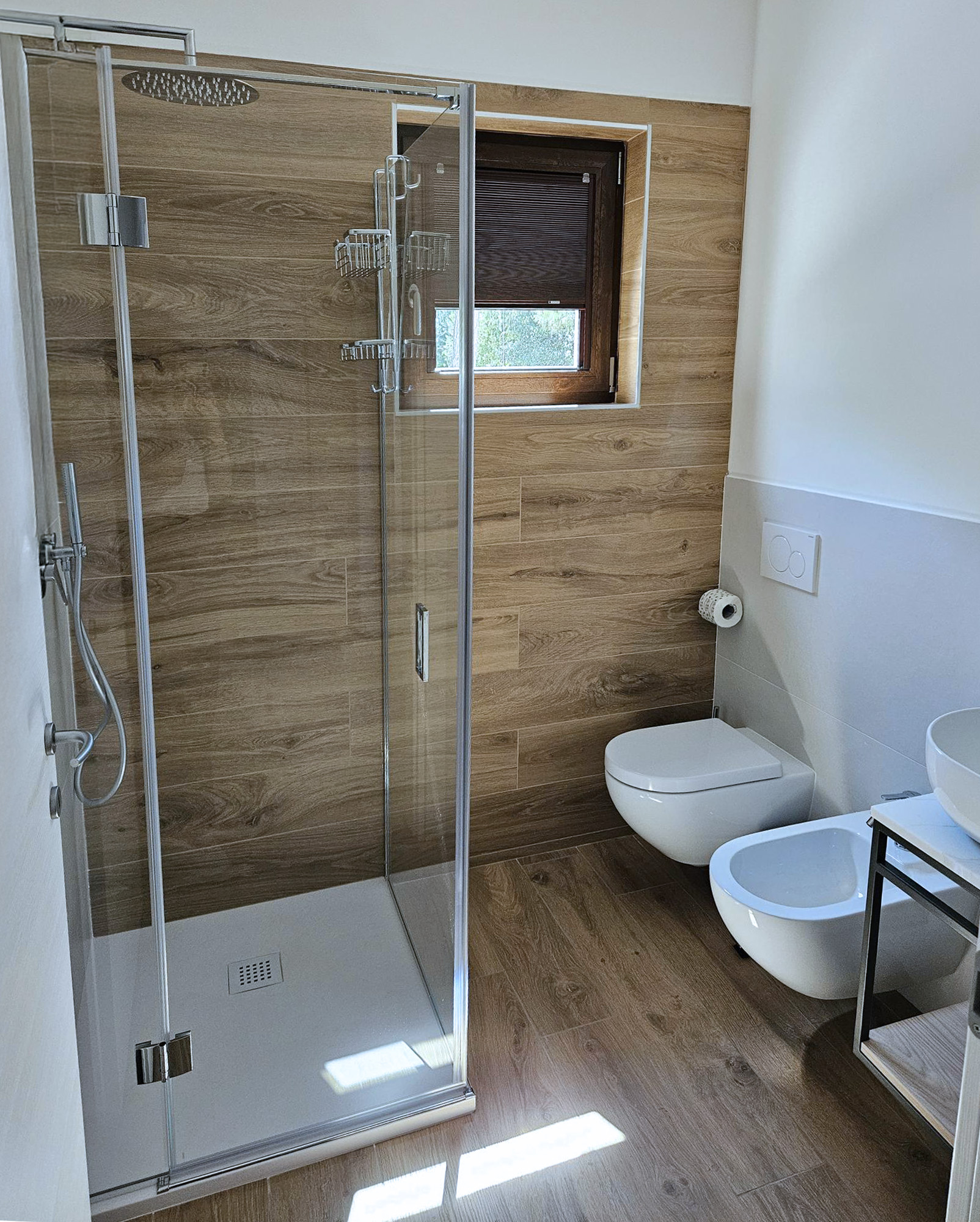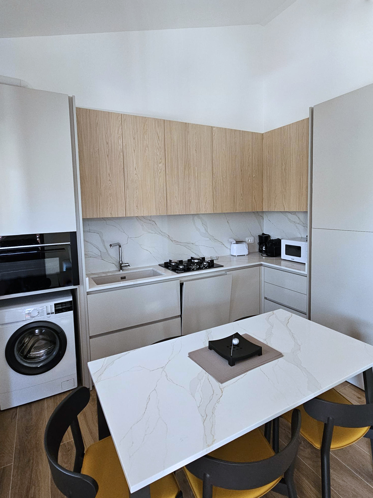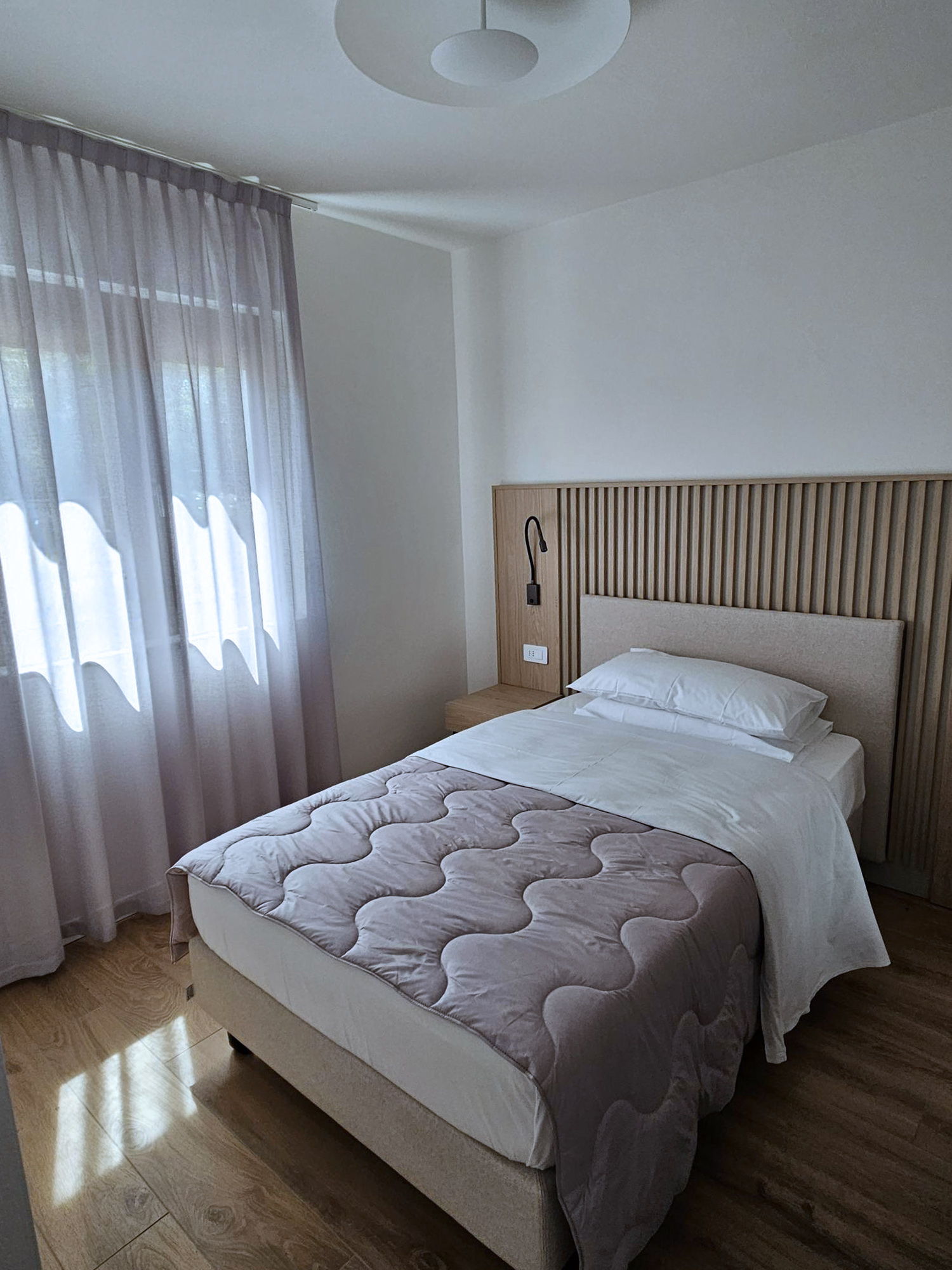 Położone na pierwszym piętrze mieszkanie ma powierzchnię około 80 m². Wewnątrz znajduje się duży salon z sofą, kuchnia wyposażona we wszystkie przydatne akcesoria do komfortowego pobytu, takie jak kuchenka, zmywarka, wielofunkcyjny piekarnik, lodówka z zamrażarką, sztućce i akcesoria. Dwie łazienki z prysznicami, sypialnia z łóżkiem podwójnym (które można rozdzielić na dwa pojedyncze), sypialnia z dwoma łóżkami pojedynczymi (które można połączyć w łóżko podwójne) oraz sypialnia z łóżkiem pojedynczym uzupełniają mieszkanie. Jest to idealne rozwiązanie dla maksymalnie pięciu osób. Do dyspozycji Gości jest telewizor, klimatyzacja i pralka.