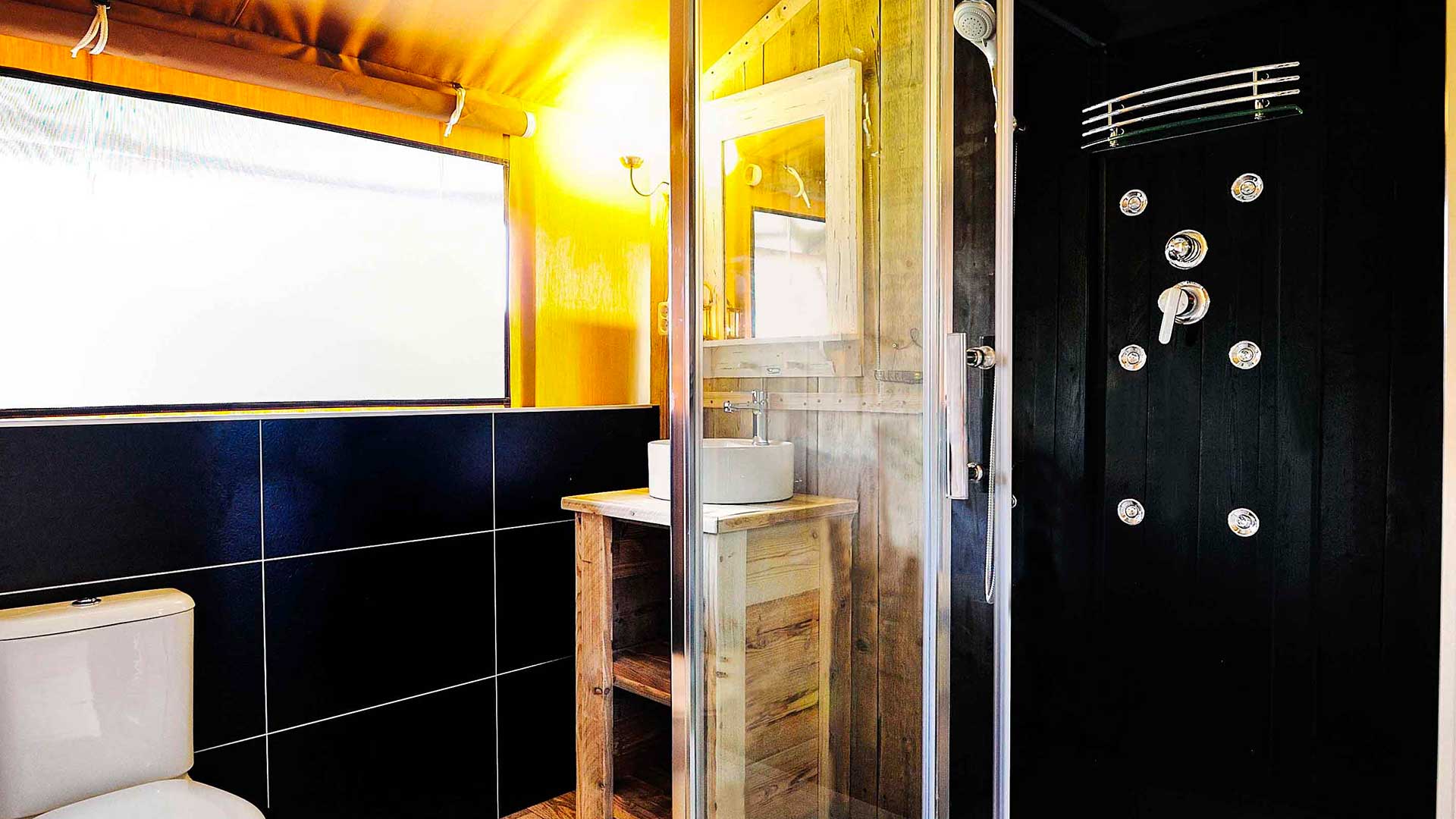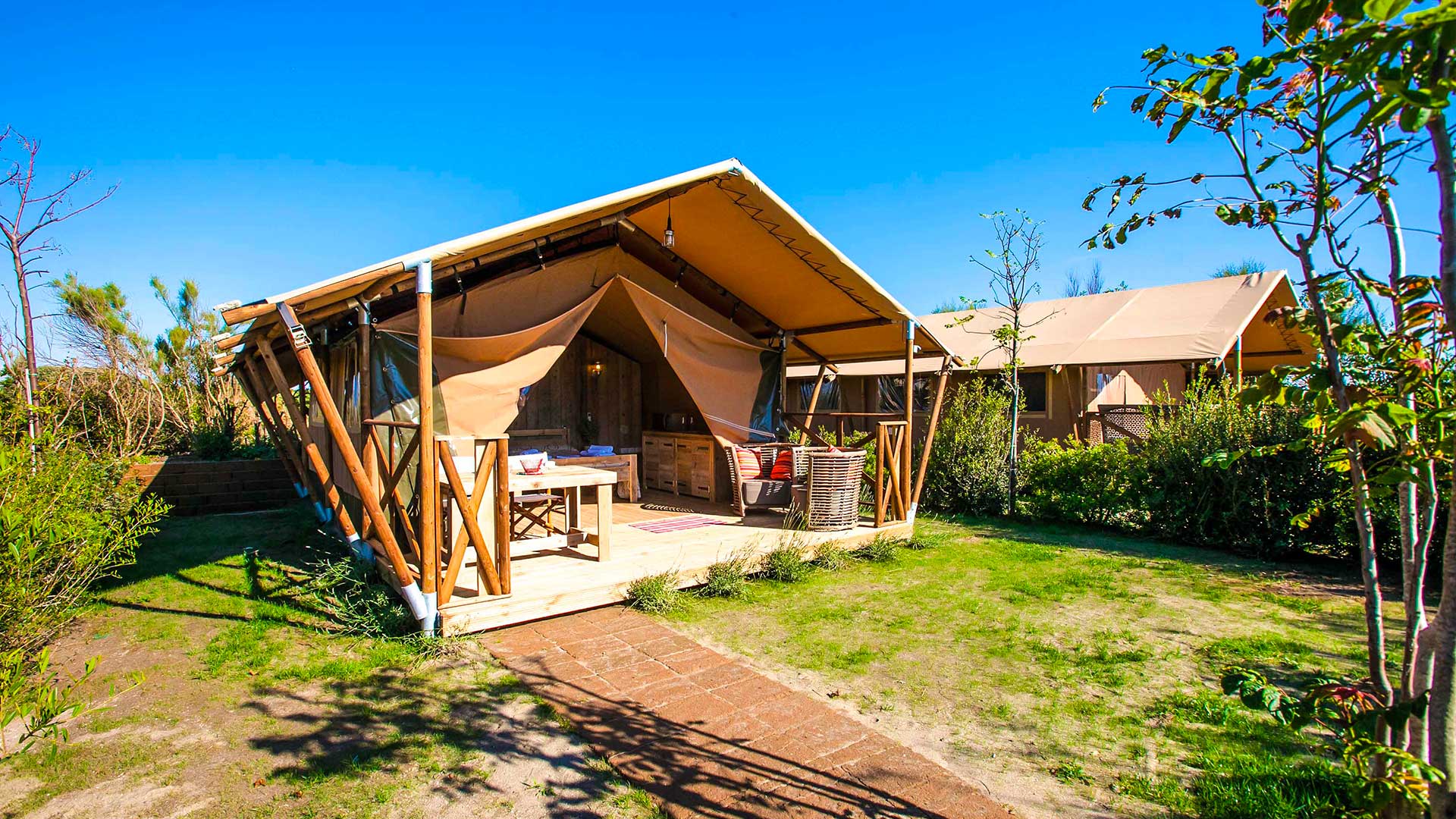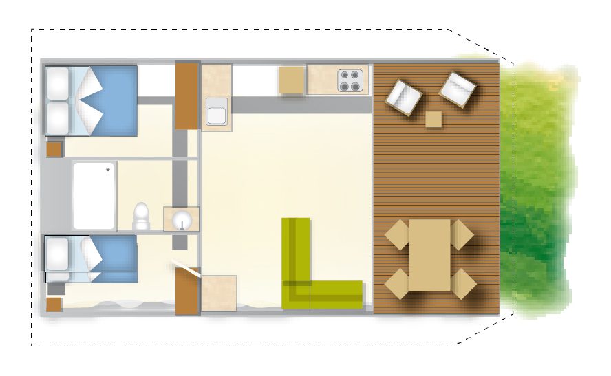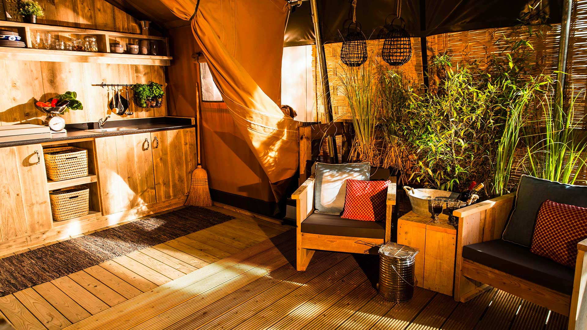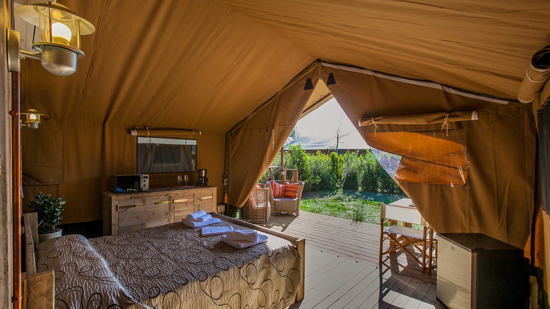 SUNLODGE BINTULU spełnia wszystkie potrzeby miłośników glampingu w dobrym stylu. Piękno biwakowania pod namiotem, ale ze wszystkimi wygodami domu! To rozwiązanie o powierzchni ok. 30 m² może pomieścić maksymalnie 4 osoby dorosłe + 1 dziecko. Posiada duży salon ze stołem, krzesłami, ławą, aneksem kuchennym wyposażonym w lodówkę z kostkarką do lodu, 4-palnikową płytę grzewczą, zlewozmywak, garnki, patelnie i naczynia. Część sypialna składa się z 2 pokoi, z których jeden wyposażony jest w łóżko podwójne, a drugi w 1 łóżko piętrowe. W apartamencie znajduje się kompletna łazienka z toaletą, dużą kabiną prysznicową i umywalką. Na zewnątrz znajduje się duża zadaszona drewniana weranda ze stołem, krzesłami, fotelami i 2 leżakami. Brak klimatyzacji.