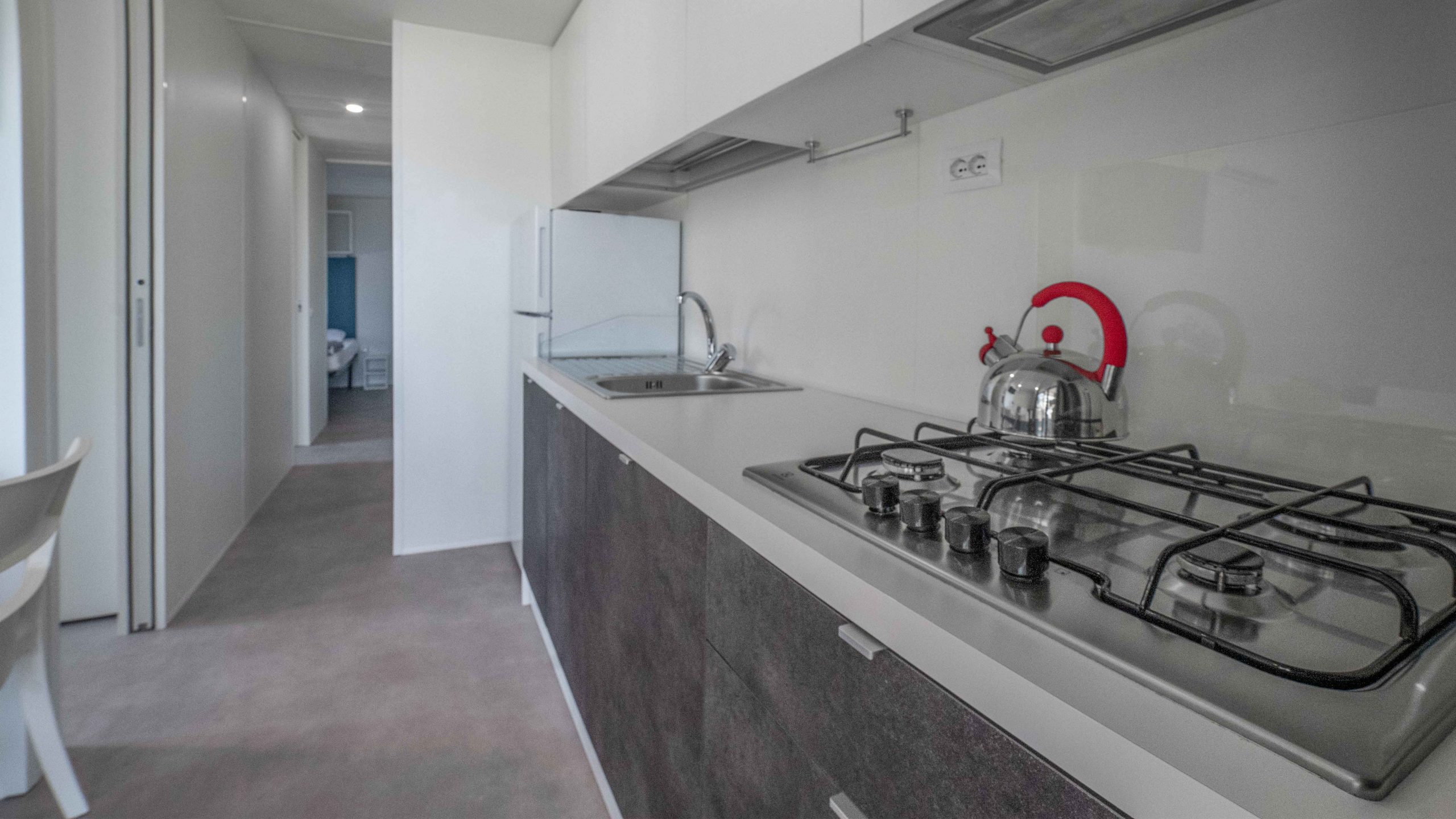 Ma niedawno odnowione wnętrze: wyrafinowany i wygodny salon wyposażony jest w stół i krzesła, wygodną sofę oraz aneks kuchenny wyposażony w lodówkę kolumnową z zamrażarką, czteropalnikową płytę grzejną, zlew oraz asortyment garnków, patelni i naczyń.