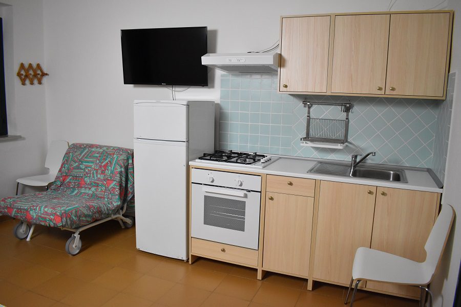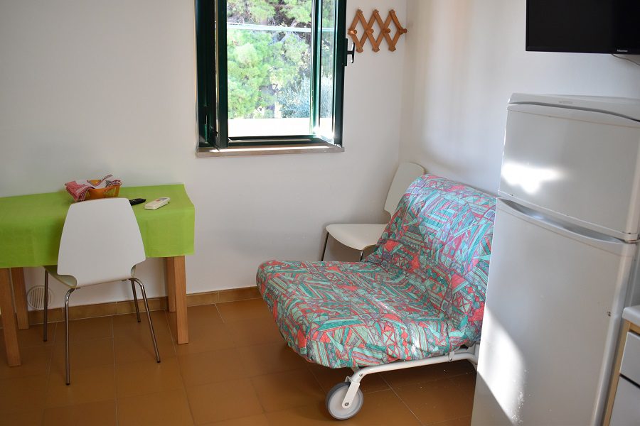Pokój jednoosobowy wyposażony w podwójne łóżko i pojedynczą rozkładaną sofę, stół, krzesła, TV, aneks kuchenny wyposażony w lodówkę z zamrażarką, kuchenkę 4-palnikową, zlewozmywak, garnki, patelnie, naczynia.