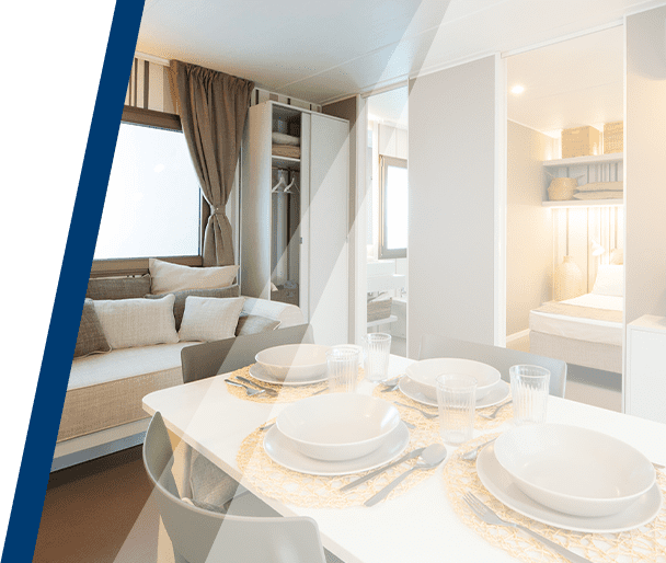 Domki mobilne (Mobile Home) to jednostka mieszkalna wyprodukowana przy użyciu nowoczesnych technologii i materiałów przyjaznych środowisku. Składa się z żelaznej ramy i ekologicznych podpór, modułowych paneli i jest pokryta płaszczem termicznym dla zapewnienia lepszej termoizolacji. Z definicji jest to dom wakacyjny ale został wyposażony w niezbędne udogodnienia, aby nasi goście nawet na wakacjach mogli czuć się jak w domu. Domki mobilne posiadają wygodne sypialnie, duży i jasny salon, wyposażony aneks kuchenny z lodówką, łazienkę z prysznicem oraz na zewnątrz drewniany taras lub werandę. Każdy domek posiada zestaw mebli tarasowych, aby móc cieszyć się posiłkami na świeżym powietrzu. Domki wyposażone są w klimatyzację w salonie, telewizję satelitarną, zastawę stołową i sztućce, poduszki i koce. Ten typ zakwaterowania jest doskonałą propozycją na rodzinne wakacje lub wypad z przyjaciółmi.